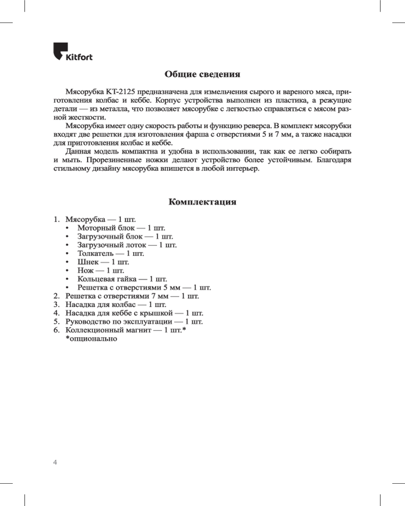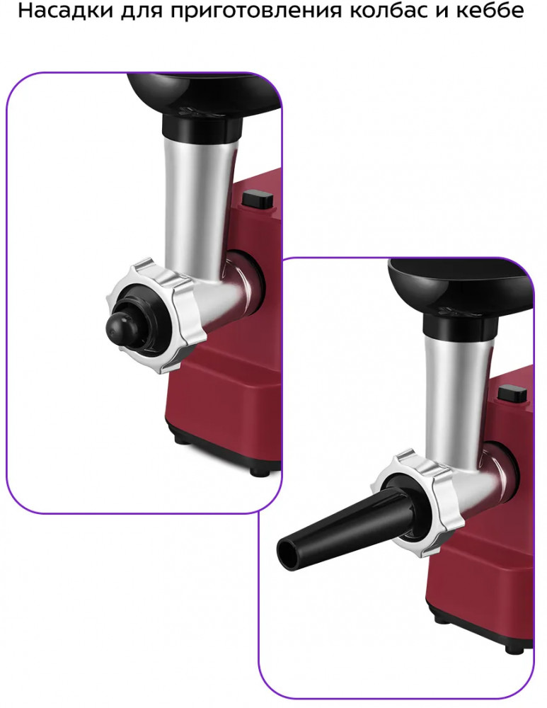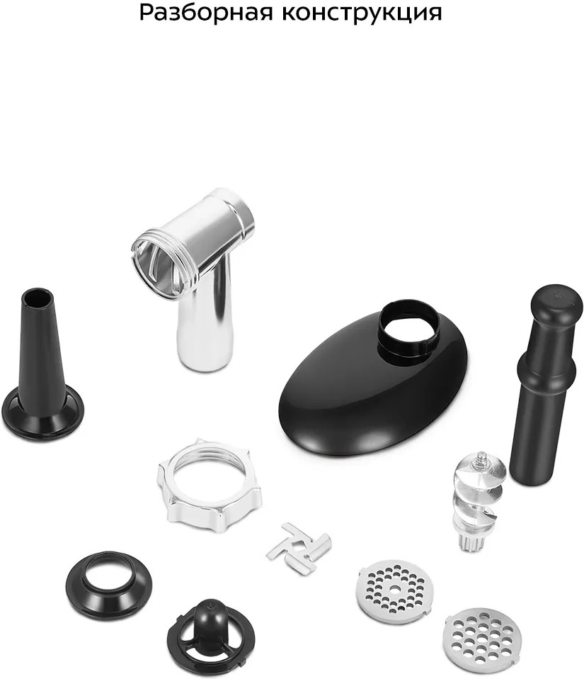 • комплектация — документация, загрузочный лоток, насадка для кеббе, насадка для колбас, перфорированный диск 2 шт., толкатель;