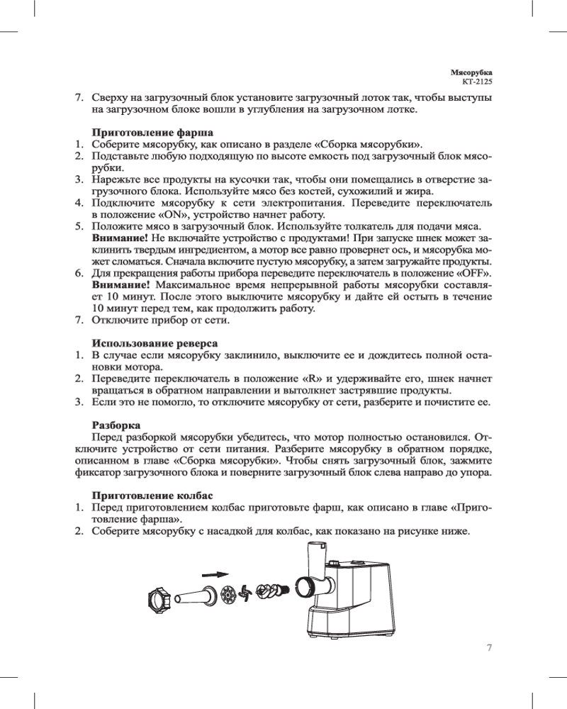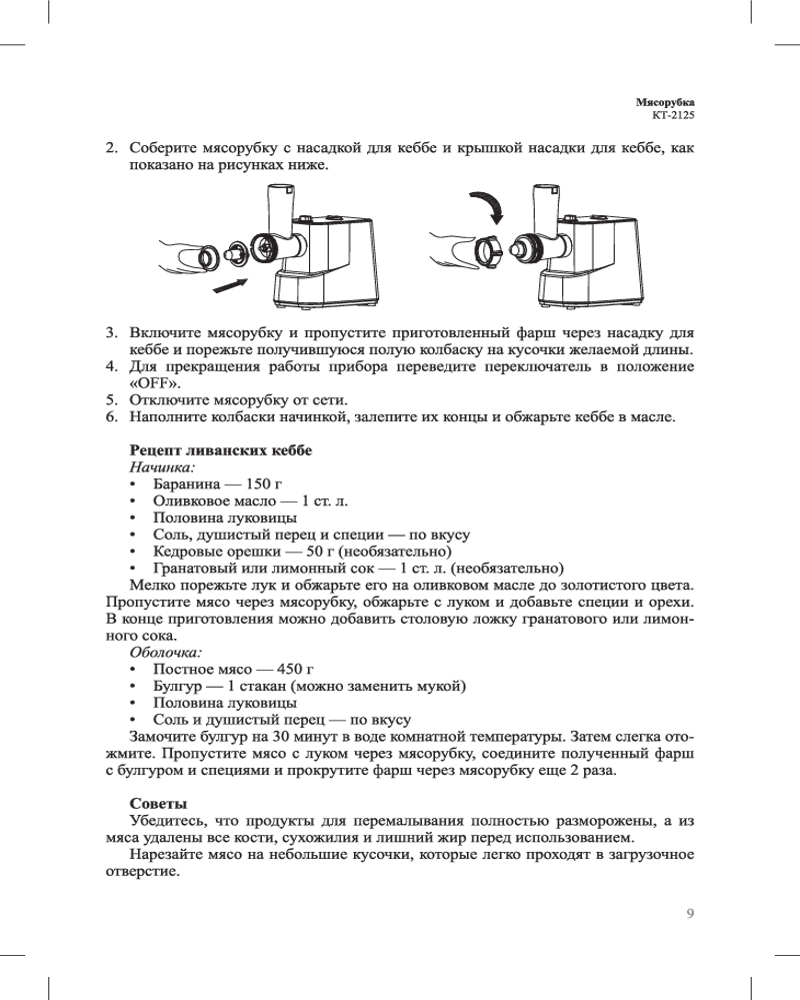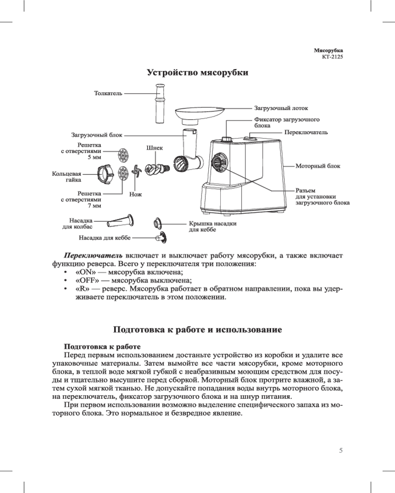 В данный момент этот товар отсутствует в продаже. Возможно, у нас найдется аналогичный или похожий товар здесь. Мясорубка КТ-2125 предназначена для измельчения сырого и варёного мяса, приготовления колбас и кеббе. Модель удобна в использовании, отличается высокой производительностью 1 кг/мин. Идеально для приготовления домашних блюд!