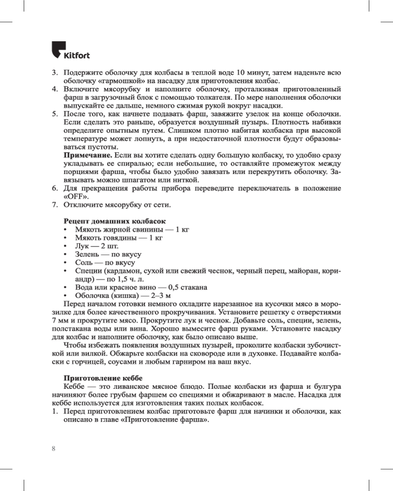 В комплект также входят насадка для колбас, которая поможет сделать красивые и ровные колбасы, а также насадка для приготовления кеббе — национального ливанского блюда.