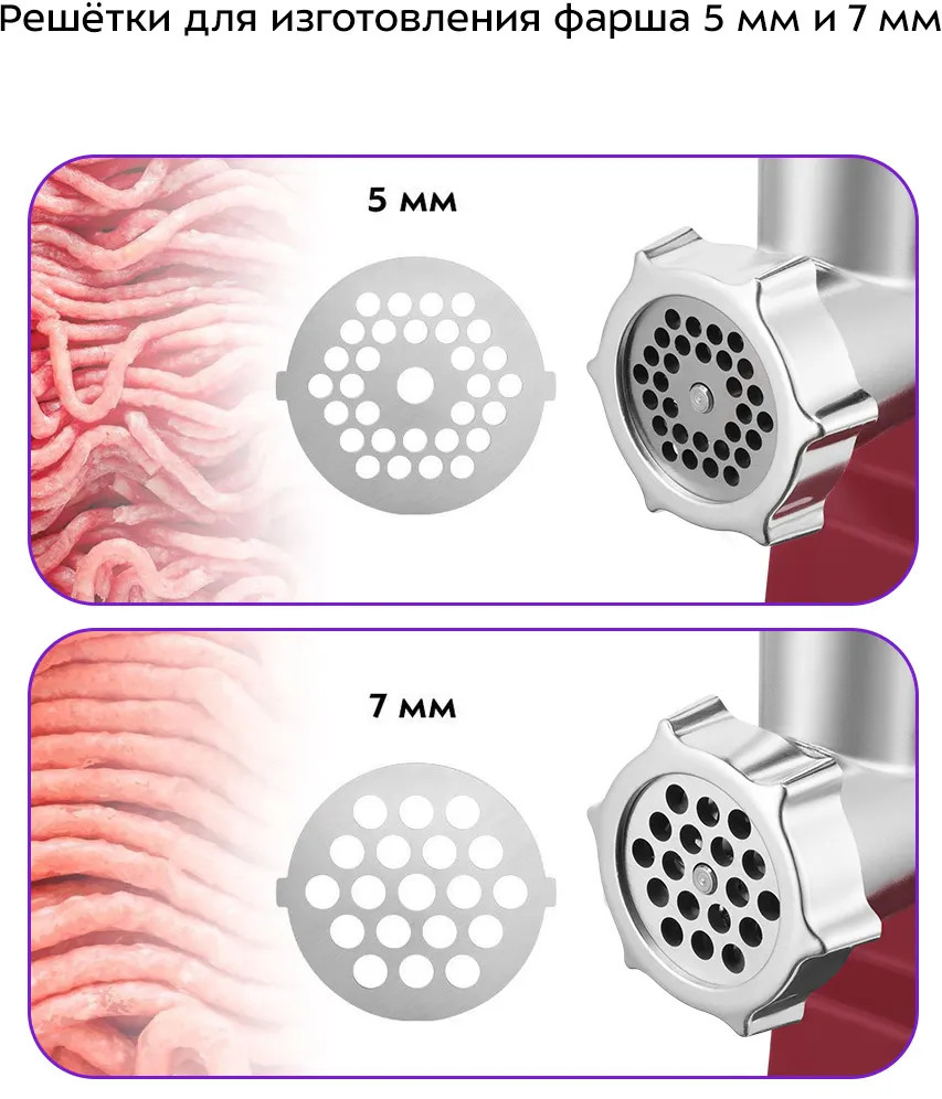 В комплект мясорубки входят 2 решётки для изготовления фарша с отверстиями 5 мм и 7 мм. Они позволят сделать как фарш для котлет и бифштекса, так и для нежнейших фрикаделек.
