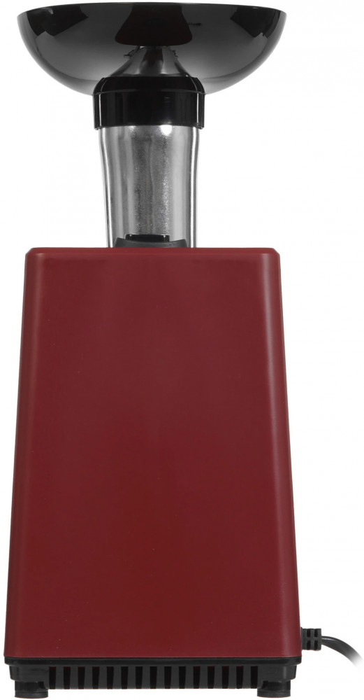 Корпус устройства выполнен из пластика, а режущие детали — из металла, что позволяет мясорубке с лёгкостью справляться с мясом разной жёсткости. В комплекте есть специальный толкатель. Прорезиненные ножки делают устройство более устойчивым на столе.