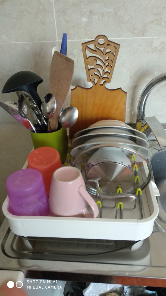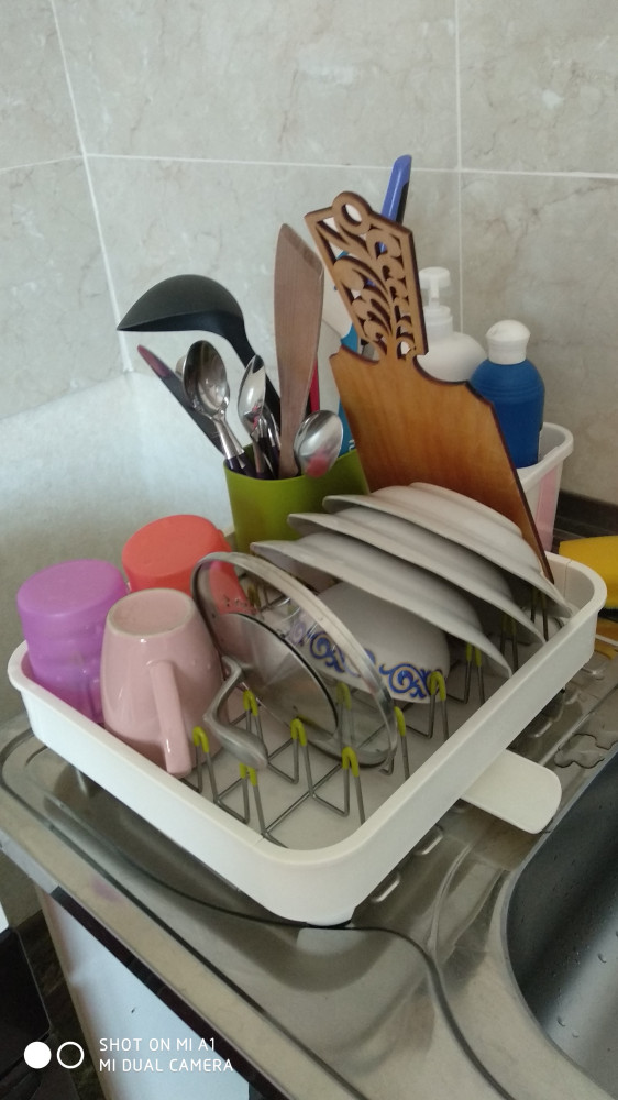 Отличное качество и стильный дизайн. Очень приятно, что вода не застаивается под посудой, стекает лишняя по желобку-"носику". Нет металлических частей, которые бы ржавели и портили вид. Все крепления добротные и нет ощущения, что где-то что-то может отломаться. Советую для каждой хозяйки!