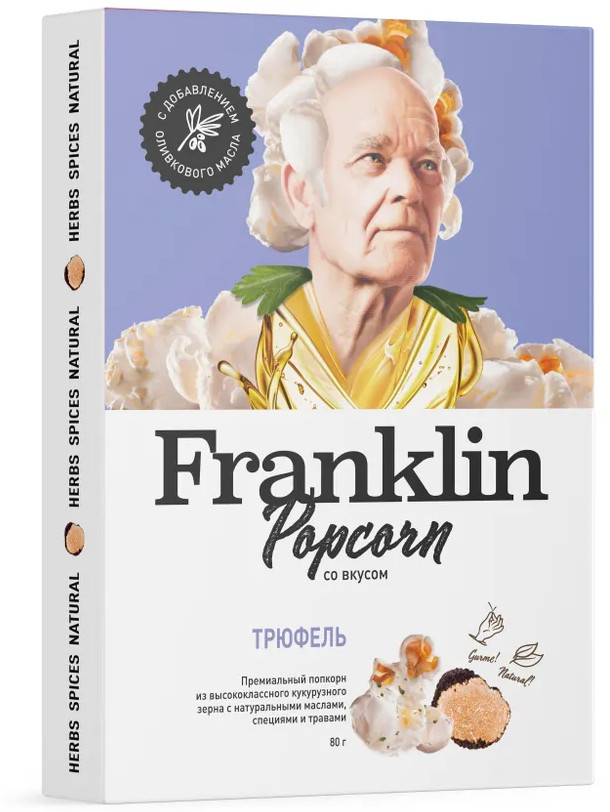 Franklin Popcorn — премиальный гурмэ-попкорн для микроволновки. Мы обожаем попкорн и, опираясь на более чем 100-летние традиции его приготовления, создали продукт, который раскрывает настоящий вкус этого лакомства — натуральный, ароматный и по-настоящему вкусный.