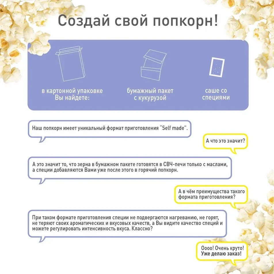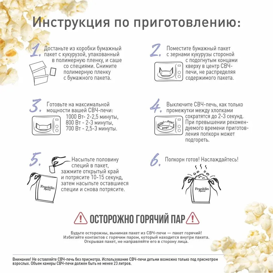 Почему Franklin Popcorn — это особенный попкорн? В классическом попкорне для СВЧ все ингредиенты находятся внутри пакета. При экстремально высокой температуре микроволновки натуральные специи или овощи просто сгорают. Поэтому производители ограничиваются солью и устойчивыми ароматизаторами.