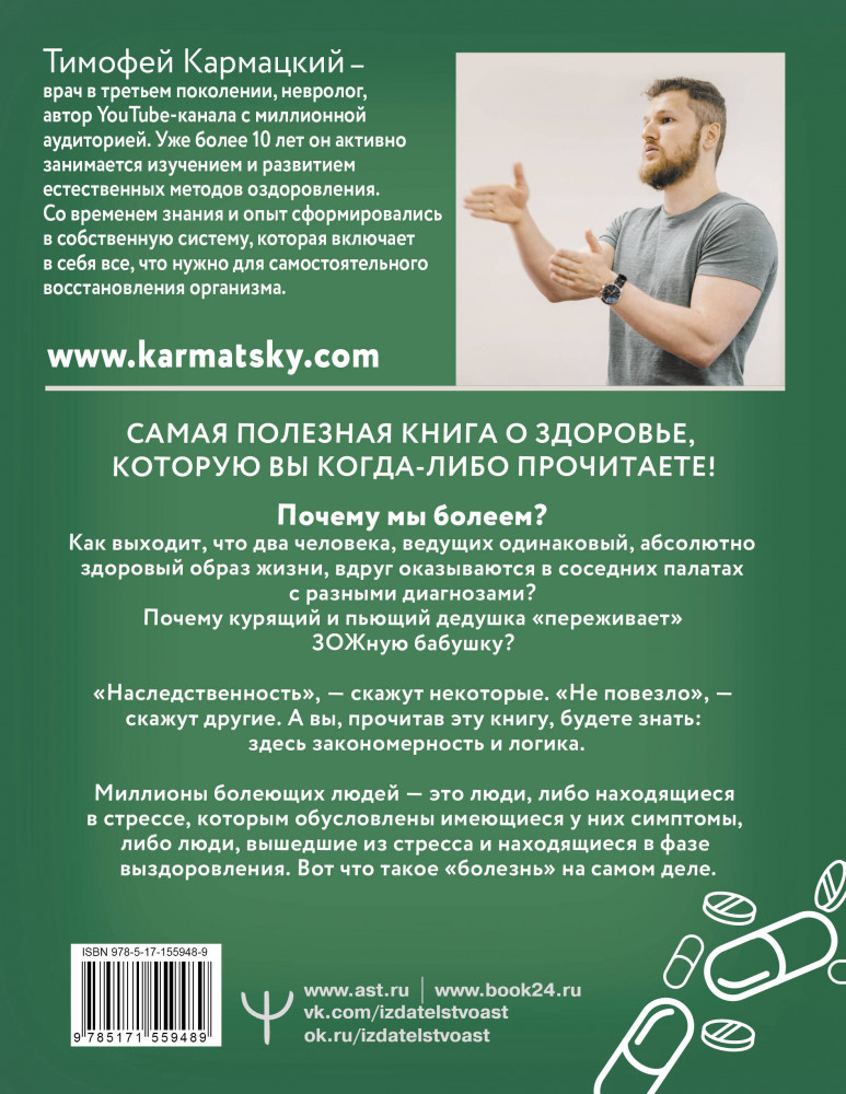 Тимофей Кармацкий — врач в третьем поколении, невролог, автор YouTube-канала с миллионной аудиторией. Уже более 10 лет он активно занимается изучением и развитием естественных методов оздоровления. Со временем знания и опыт сформировались в собственную систему, которая включает в себя все, что нужно для самостоятельного восстановления организма. «Зная классическую медицину с детства, я прекрасно понимаю, как не надо лечить человека». |