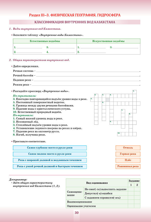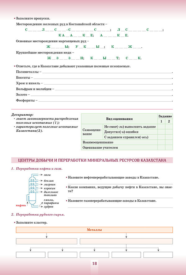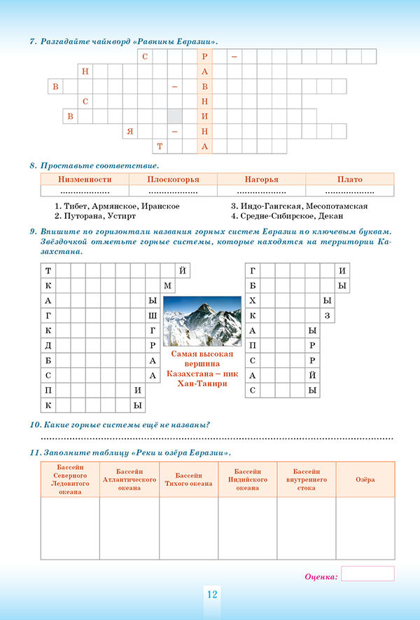 💳 Оплатить за товар можно при получении 🇰🇿 Есть бесплатная доставка по Казахстану от 1 дня 🎁 Копите бонусы с каждой покупки Данная рабочая тетрадь составлена к курсу «География Казахстана» и предназначено для формативного оценивания и подготовки к суммативному. Пособие содержит материал, адаптированный ко всем учебникам обновлённого содержания. Все задания соответствуют учебной программе, утверждённой МОН РК, и способствуют развитию у обучающихся памяти, логического мышления и творческого подхода к изучению основ естественных наук. Использованы различные формы заданий и виды работы, что способствует повышению интереса школьников к обучению, углублению географических знаний. |