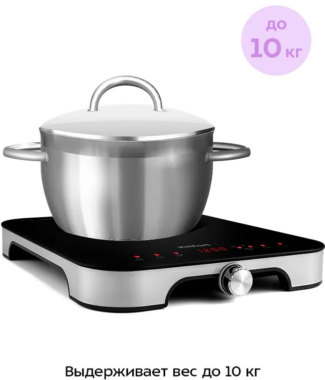 Для индукционной плиты подходит посуда с дном из ферромагнитных материалов: стальная, чугунная, эмалированная, посуда из нержавеющей стали, а также любая другая, предназначенная для индукционного нагрева. Плита выдерживает вес не более 10 кг.