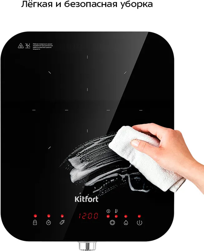 Благодаря особенностям индукционного нагрева, рабочая поверхность плиты КТ-148 во время готовки не нагревается, поэтому после приготовления еды вы можете с легкостью убрать её от остатков пищи и прочих загрязнений.