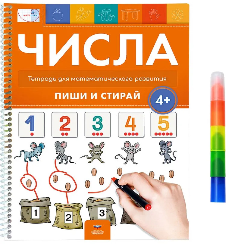 В тетради представлена система заданий, которая поможет ребенку: познакомиться с цифрами и научиться их писать; освоить счет в пределах 10; получить первое представление о составе чисел в пределах 10; овладеть навыком структурного счета, научиться определять количество предметов с одного взгляда, структурируя его по небольшим группам. На ламинированных страницах этой тетради можно писать маркерами и фломастерами. Они легко стираются ватным диском или влажной салфеткой. Возможность пробовать разные способы выполнения заданий и исправлять ошибки позволит ребенку экспериментировать с множествами, прочнее усваивая базовые математические закономерности. А красочные персонажи и сюжеты превратят знакомство с цифрами и числами в увлекательное занятие. Благодаря удобному формату многоразовые прописи удобно брать с собой в дорогу, путешествия. Если вы хотите подарить ребенку развивающую игрушку или увлекательную игру для развития логики, усидчивости, памяти и мелкой моторики рук, то советуем обратить внимание увлекательные задания для детей «Пиши и стирай». Это отличный подарок на день рождения, новый год или другой праздник для мальчика и девочки в возрасте от 4 до 7 лет.