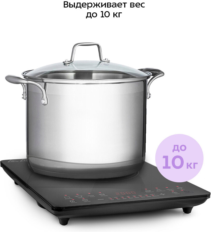 Для индукционной плиты подходит посуда с дном из ферромагнитных материалов: стальная, чугунная, эмалированная, посуда из нержавеющей стали, а также любая другая, предназначенная для индукционного нагрева. Плита выдерживает вес не более 10 кг.