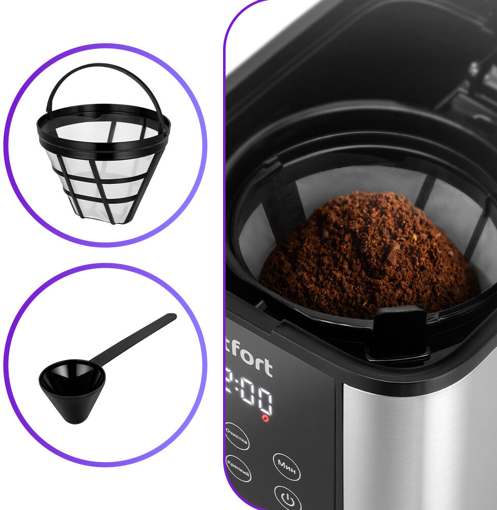 Кофеварка оснащена нейлоновым фильтром, которым можно пользоваться неограниченное количество раз. Его удобно мыть после приготовления кофе и использовать снова. Для удобства использования в комплекте идёт мерная ложка.