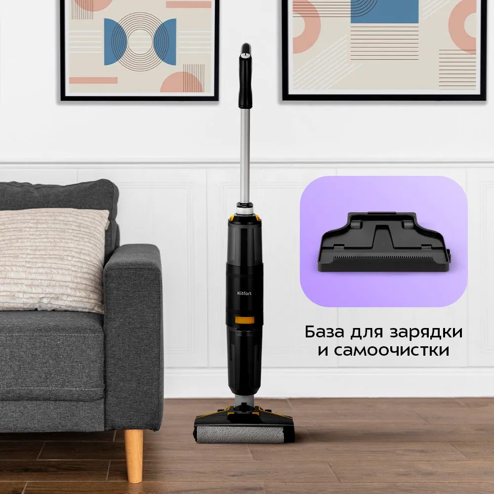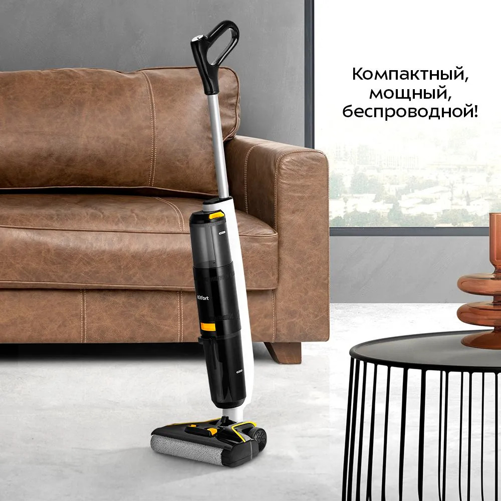 Вертикальный беспроводной моющий пылесос КТ-5220 очень удобен для проведения сухой и влажной уборки. Благодаря работе от аккумулятора во время использования пылесос не нужно включать в сеть, следовательно, провода не будут мешать под ногами.
