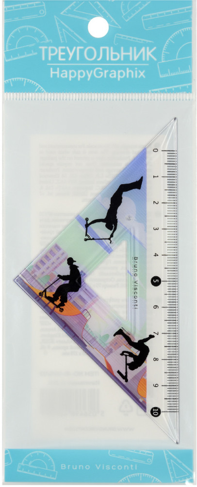 Bruno Visconti Линейка-треугольник «HappyGraphix. Самокаты»В данный момент этот товар отсутствует в продаже. Возможно, у нас найдется аналогичный или похожий товар здесь. Линейка-треугольник «Самокаты» из коллекции «Happy Graphix» с углом 45 градусов. Прекрасный помощник для школьников на уроках алгебры и геометрии. Дизайн имеет мужской характер, так как отображает модную городскую культуру экстремального спорта . Линейка изготовлена из нетоксичного прозрачного пластика. Это компактная линейка с длиной разметки 10 см, которая поместится в стандартный школьный пенал. Шкала с разметкой нанесена тиснением и не сотрется. По измерительной стороне линейки есть фаска, поэтому треугольник удобно приложить и удерживать на бумаге, чтобы чертить точно и ровно. |