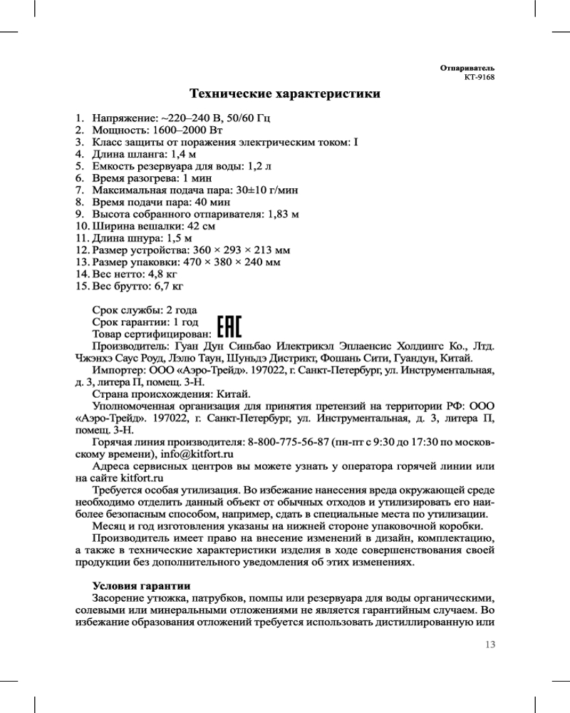 • отпариватель — 1 шт.;
