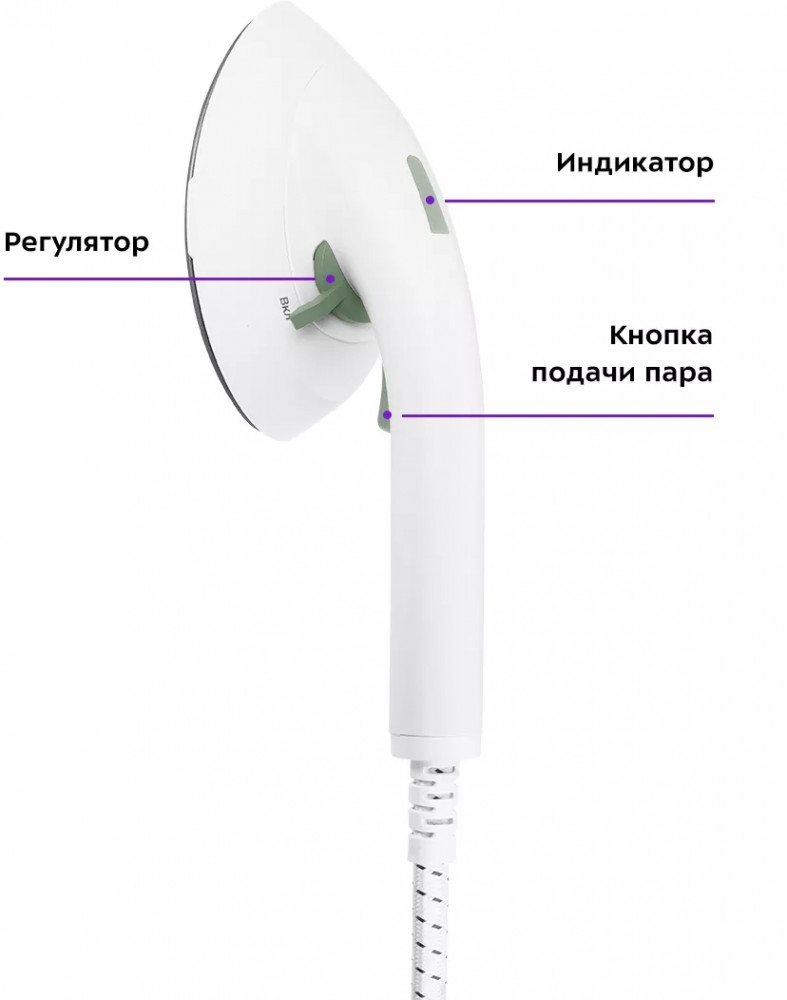 Чтобы включить нагрев утюжка, поверните регулятор справа налево до упора. Загорится индикатор. Когда прибор достигнет нужной температуры для подачи пара, индикатор погаснет. Чтобы включить подачу пара, нажмите и удерживайте кнопку подачи пара.