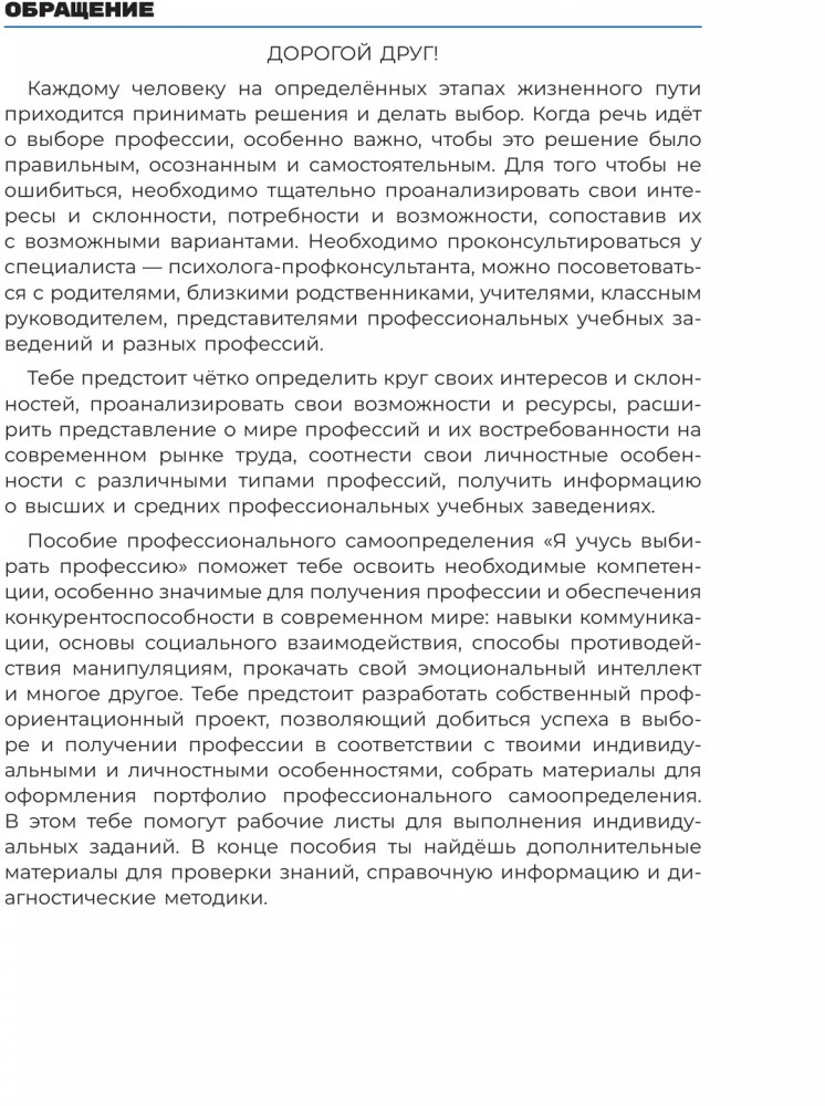 Пособие «Я учусь выбирать профессию», адресованное учащимся 8-9 классов, является частью учебно-методического комплекта, в который входят также программа внеурочной деятельности и методические рекомендации для педагогов, комплект тематических рабочих листов для создания личного портфолио профессионального самоопределения. Работа с пособием предполагает взаимодействие ученика, педагога и родителей, направленное на создание условий для формирования профессиональной готовности на данном образовательном этапе с учётом возрастных особенностей. |