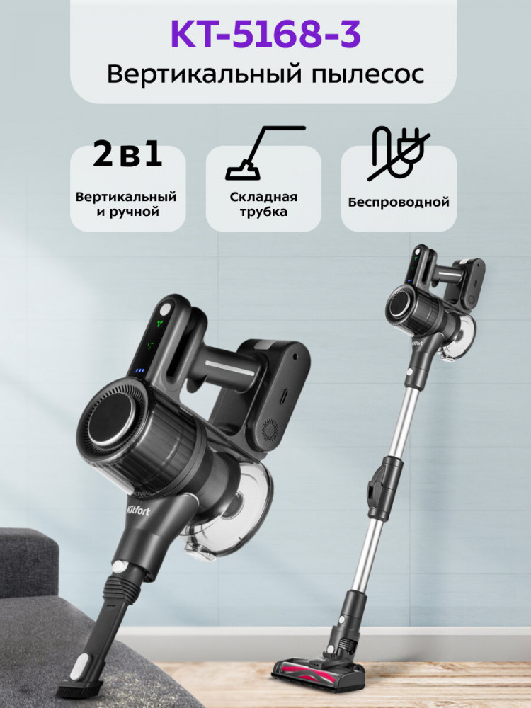 Беспроводной вертикальный пылесос КТ-5168 удобен при локальной и генеральной уборке. Он компактен, всегда под рукой и готов к работе. Утомительный процесс превращается в лёгкое и увлекательное занятие, а время уборки сокращается вдвое!