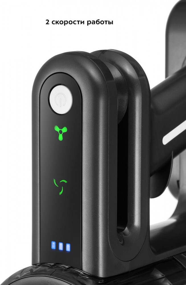 На панели управления расположены кнопка «Вкл/Выкл», индикаторы скорости и заряда аккумулятора. В пылесосе 2 скорости. При включении пылесос автоматически будет работать на 1 скорости. Для переключения на 2 скорость нажмите на кнопку переключения скорости.
