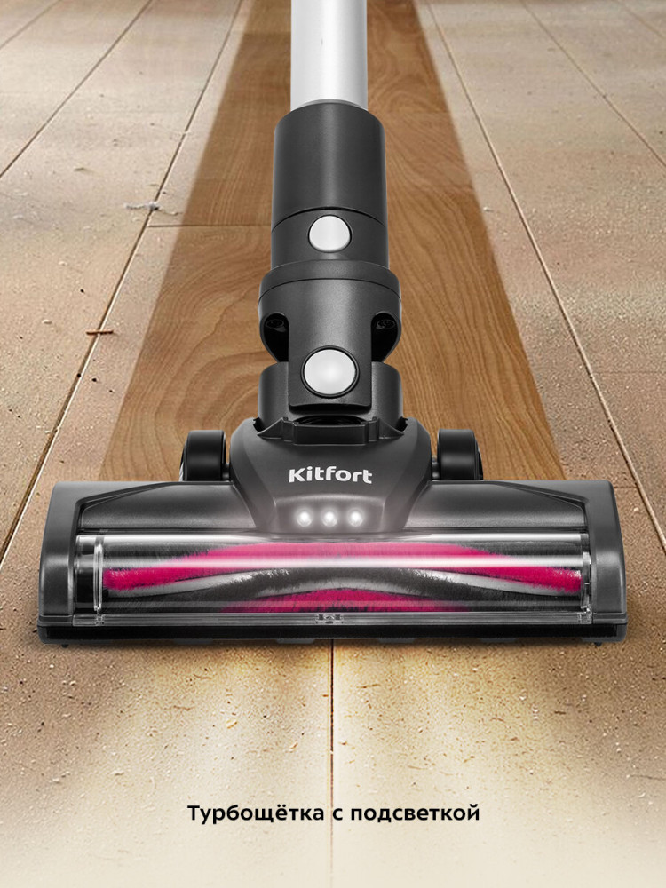 Пылесос оснащён манёвренной напольной щёткой, которая вращается в двух плоскостях. Она оснащена светодиодной подсветкой для комфортной уборки. Подсветка позволяет заметить пыль и мусор, которые при обычном свете можно пропустить.