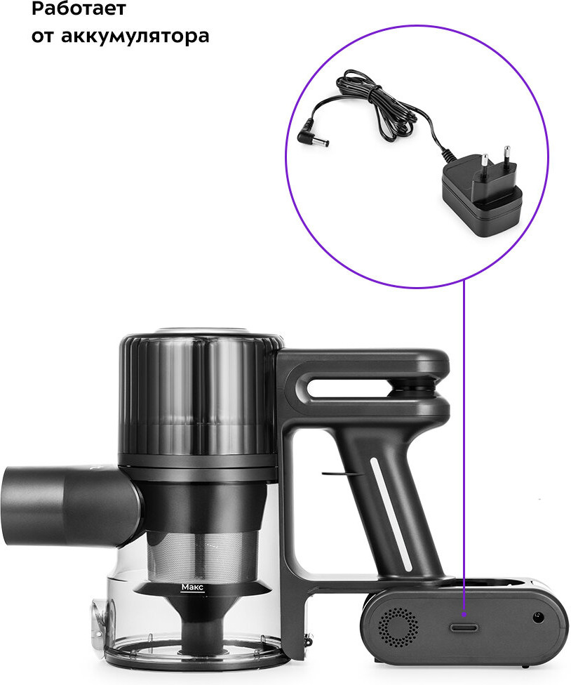 Благодаря работе от аккумулятора не нужно включать вилку в розетку, провода не мешают под ногами. Поэтому пылесос имеет неограниченный радиус действия. Обычное время зарядки составляет 4,5 часа.