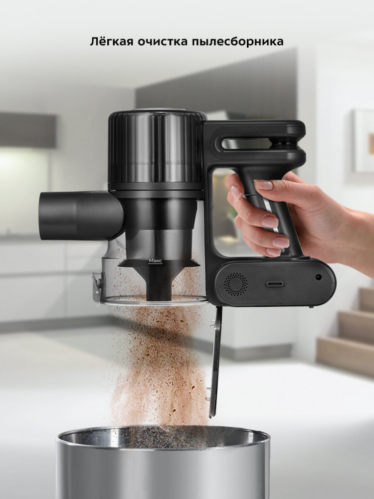Вместительный контейнер пылесборника ёмкостью 500 мл легко снимается и моется. В процессе уборки вы можете воспользоваться быстрой очисткой пылесборника. Для этого необходимо просто открыть крышку пылесборника, держа его над мусорным ведром.