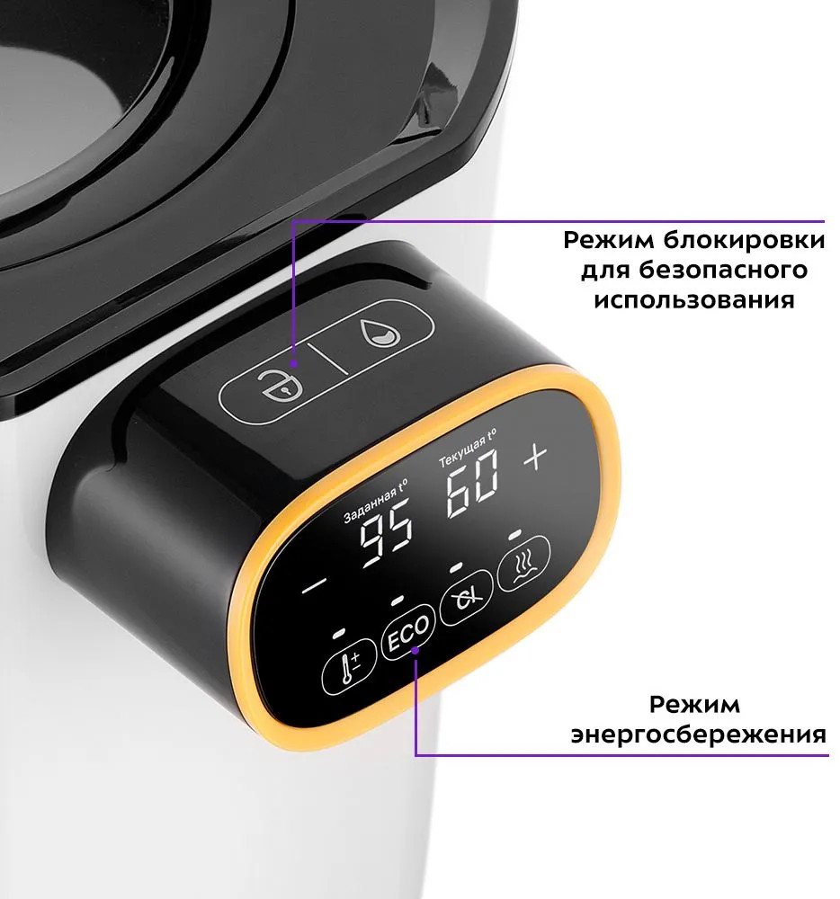 💳 Оплатить за товар можно при получении 🇰🇿 Есть бесплатная доставка по Казахстану от 1 дня 🎁 Копите бонусы с каждой покупки Термопот — это многофункциональный электрический прибор, который объединяет функции кулера, чайника и термоса. Он доводит воду до кипения и сохраняет ее горячей. Прибор одинаково удобен для домашнего применения и для использования в небольших офисах, где чай или кофе пьют часто, а тратить время на кипячение некогда. Также термопот идеально подходит для семей с маленькими детьми: можно быстро приготовить молочную смесь или кашу. Устройство работает очень просто. Нужно залить колбу водой, закрыть крышкой и включить. Для кипячения воды используется ТЭН. Когда достигается нужная температура, срабатывает термовыключатель. Процесс подогрева останавливается, а градус сохраняется в емкости за счет теплоизоляционного покрытия. Когда он начинает снижаться, нагревательный прибор снова включается, чтобы удержать заданную температуру. |