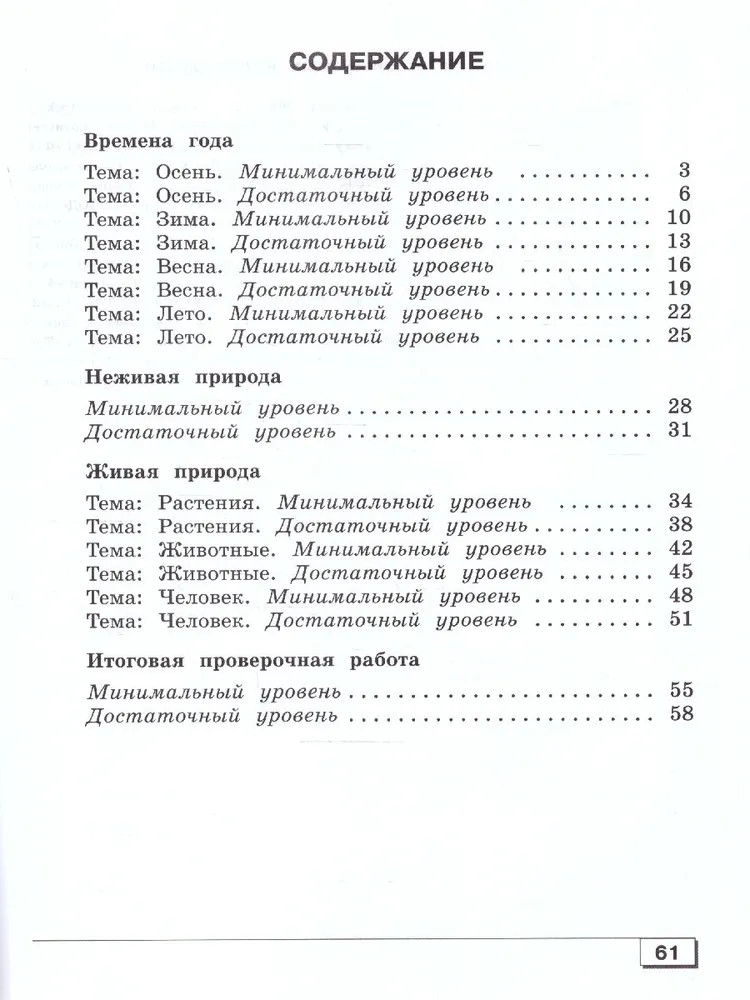 В пособие входят текущие и итоговые проверочные работы. Для каждой работы предлагается два варианта заданий: один позволяет проверить достижение минимального, а другой — достаточного уровня предметных результатов. Возможно разноуровневое (комбинированное) выполнение заданий в зависимости от индивидуальных возможностей ребёнка, выполняющего проверочную работу. Пособие предназначено для педагогов и специалистов, участвующих в образовательном процессе. Пособие будет также полезно родителям, которым важно знать, на каком уровне их дети усваивают учебный материал по отдельным изученным в школе темам и по всему курсу «Мир природы и человека» третьего года обучения. |