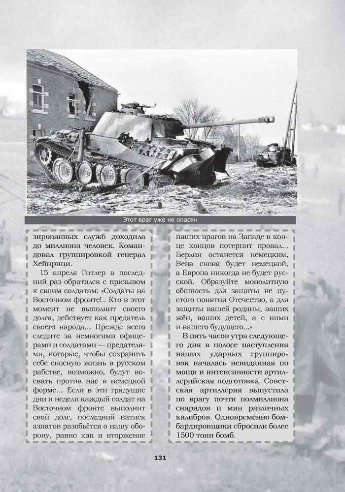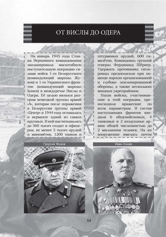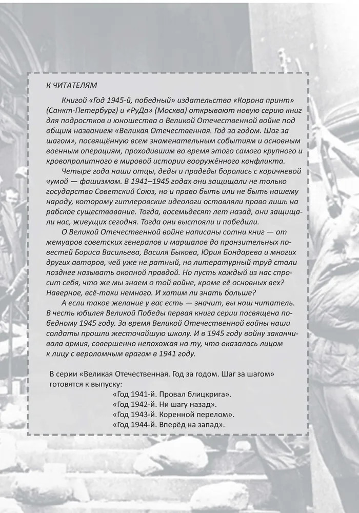 Великая Отечественная. Год за годом. Шаг за шагом. Год 1945. ПобедныйВ данный момент этот товар отсутствует в продаже. Возможно, у нас найдется аналогичный или похожий товар здесь. Короткие рассказы, представленные в книге, посвящены событиям победного 1945 года, приведшим к окончательному краху гитлеровской Германии и освобождению от фашизма стран Восточной Европы. Атмосферу тех героических дней помогает воссоздать большое количество фотографий военного времени, которые не оставят равнодушными ни детей, ни взрослых. Для детей среднего и старшего школьного возраста, а также для всех, кого волнует история родной страны. |