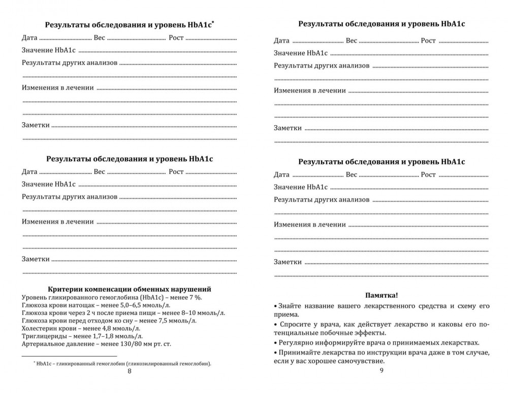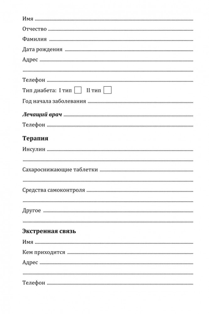 Серия: Дневник самоконтроля Дневник самоконтроля при сахарном диабете — необходимый помощник в ежедневном наблюдении за состоянием здоровья и заботе о вас и ваших близких. Самоконтроль при сахарном диабете — это определенные действия, необходимые для достижения и поддержания целевого уровня глюкозы в крови — того, который определил лечащий врач. Дневник самоконтроля поможет следить за этим уровнем. Определяя его в разное время суток и, фиксируя данные в таблице, легко определить максимальные и минимальные показатели, изучить причины тех или иных ощущений, самостоятельно оценивать эффективность сахароснижающего лечения, при необходимости менять дозы препаратов (например, инсулина), корректировать питание и физическую активность. Это поможет достичь компенсации диабета. |