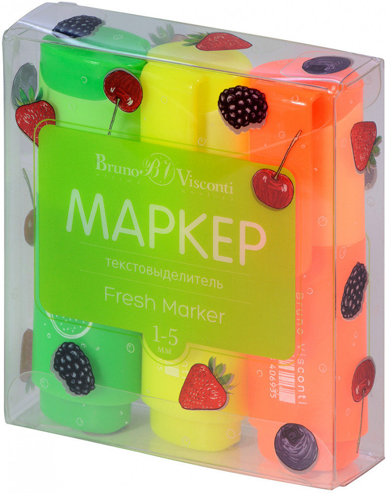 Bruno Visconti Набор текстовыделителей «Fresh Marker»В данный момент этот товар отсутствует в продаже. Возможно, у нас найдется аналогичный или похожий товар здесь. Набор текстовыделителей Bruno Visconti «Fresh Marker» — обладатели насыщенных цветов и ярких дизайнов. Чернила на водной основе не имеют запаха, мгновенно высыхают на бумаге любых сортов, не пропитывая ее, не смазывая текст. Текстовыделители до 24 часов сохраняют работоспособность без колпачка и при закрытом колпачке полностью восстанавливают свои свойства! Пишущий узел не скрипит, мягко скользит по поверхности бумаги. Его скошенная форма позволяет проводить линии различной толщины: 1-5 мм. «Fresh Marker» — это не просто текстовыделители, это стильный аксессуар, который благодаря маленькому размеру и яркому дизайну неизменно привлекает к себе внимание. |