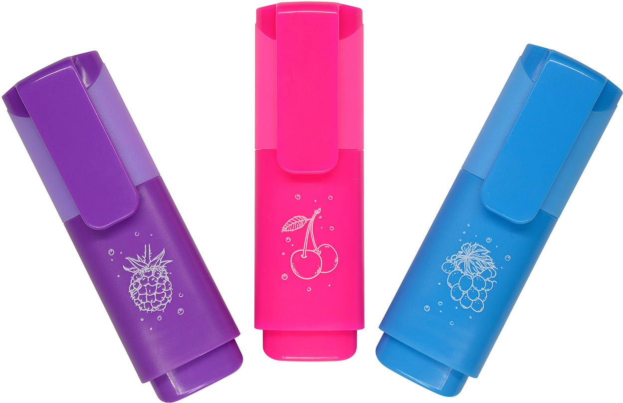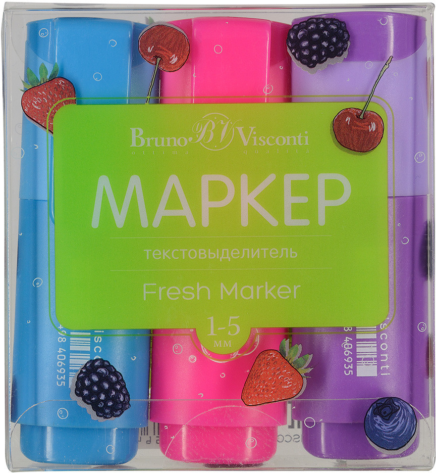 Bruno Visconti Набор текстовыделителей «Fresh Marker»В данный момент этот товар отсутствует в продаже. Возможно, у нас найдется аналогичный или похожий товар здесь. «Fresh Marker» от Bruno Visconti — это не просто текстовыделители, это стильный аксессуар, который благодаря маленькому размеру и яркому дизайну неизменно привлекает к себе внимание. Маркеры не затеряются на рабочем столе, внося позитив в трудовые будни, компактно разместятся в дамской сумочке, в школьном пенале. В наборе три цвета: фиолетовый, розовый, голубой. Чернила текстовыделителей на водной основе и не имеют запаха, мгновенно высыхают на бумаге любых сортов, не пропитывая ее, не смазывая текст. Текстовыделители до 24 часов сохраняют работоспособность без колпачка и при закрытом колпачке полностью восстанавливают свои свойства! Пишущий узел не скрипит, мягко скользит по поверхности бумаги. Его скошенная форма позволяет проводить линии различной толщины: 1-5 мм. |