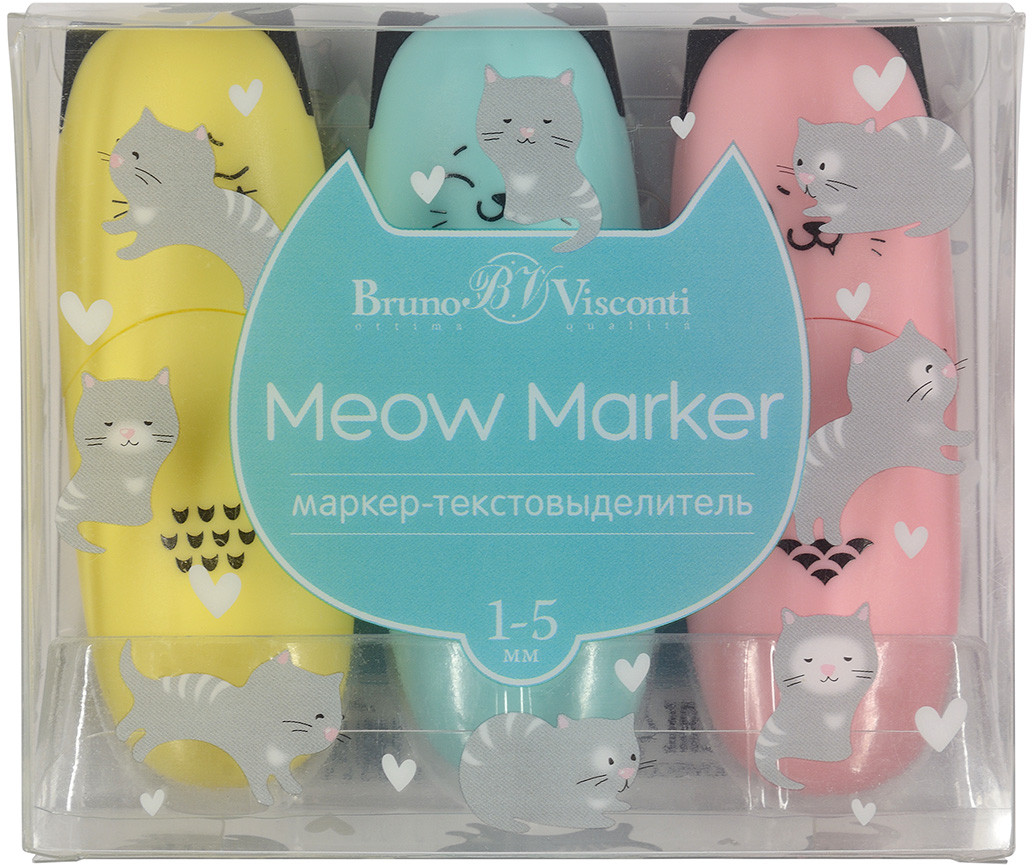 Bruno Visconti Набор текстовыделителей «Meow Marker»В данный момент этот товар отсутствует в продаже. Возможно, у нас найдется аналогичный или похожий товар здесь. Набор из трех текстовыделителей «Meow Marker» отличный выбор для любителей нежных дизайнов. Эргономичный корпус из ударопрочного пластика с изображением кошачьих мордочек, передающих различные эмоции, и ушками-антистресс внесут позитивную нотку в рабочие серые будни. Качество чернил и пишущего узла доставят удовольствие в работе с текстом, когда необходимо выделить отдельные его фрагменты. Чернила на водной основе, не имеют запаха, мгновенно высыхают на бумаге любых сортов, не пропитывая ее, не смазывая текст. Текстовыделители до 24 часов сохраняют работоспособность без колпачка и при закрытом колпачке полностью восстанавливают свои свойства! Пишущий узел, не скрипит, мягко скользит по поверхности бумаги. Его скошенная форма позволяет варьировать ширину письма: широкая часть наконечника 5 мм — для выделения текста, узкая в 1 мм — для подчеркивания. |