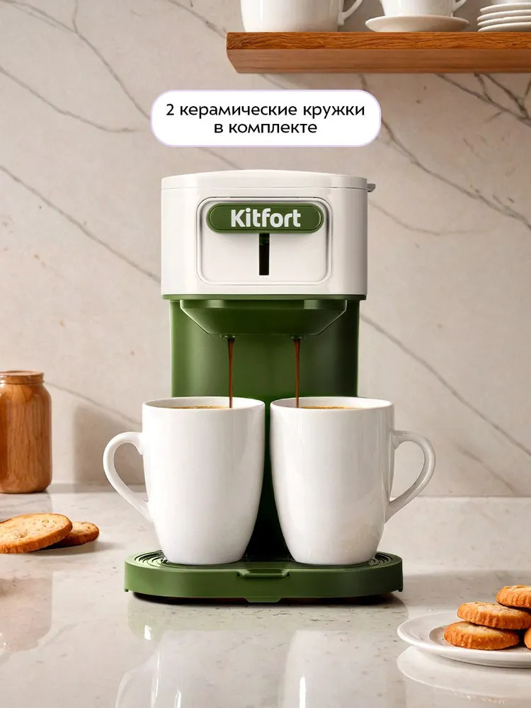 В капельной кофеварке горячая вода медленно поступает в фильтр с молотым кофе. Пройдя через фильтр, кофе попадает в кружки. Кофеварка предназначена для приготовления двух порций кофе одновременно. Две керамические кружки идут в комплекте.