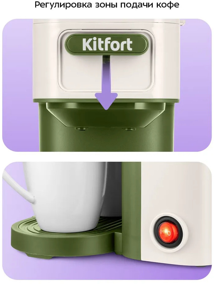 Чтобы запустить работу кофеварки нужно нажать лишь 1 кнопку. Помимо кнопки включения кофеварка так же оснащена рычагом-регулятором зоны подачи кофе. Передвигая рычаг, вы можете отрегулировать высоту носиков для подачи кофе.