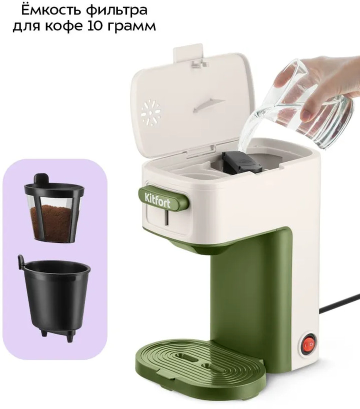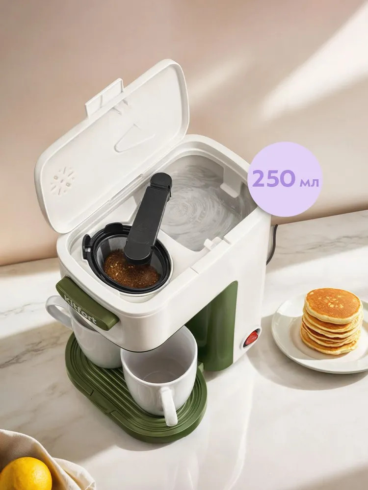 Ёмкость резервуара для воды в кофеварке составляет 250 мл, а ёмкость каждой кружки 125 мл. Под кружками расположен поддон для капель с подставкой. Также вы можете использовать собственные кружки схожего объёма.