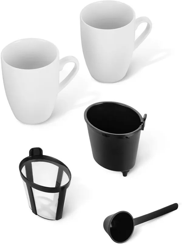 В комплекте к кофеварке идут 2 керамические кружки по 125 мл, многоразовый фильтр для кофе и мерная ложечка, с помощью которой вы сможете засыпать точное количество кофе в фильтр.