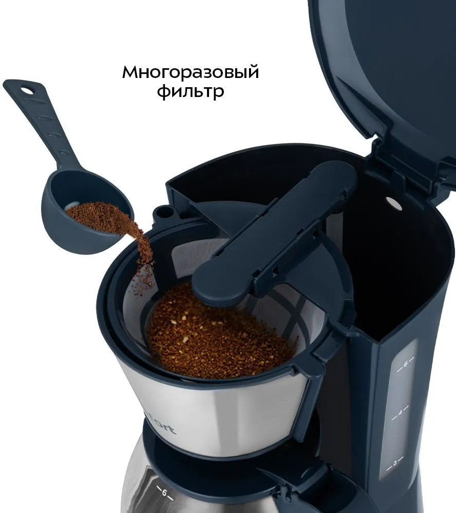 Кофеварка оснащена многоразовым фильтром, который можно использовать неограниченное количество раз, а так же в комплекте идёт мерная ложечка, которая позволит вам точно регулировать количество используемого кофе.