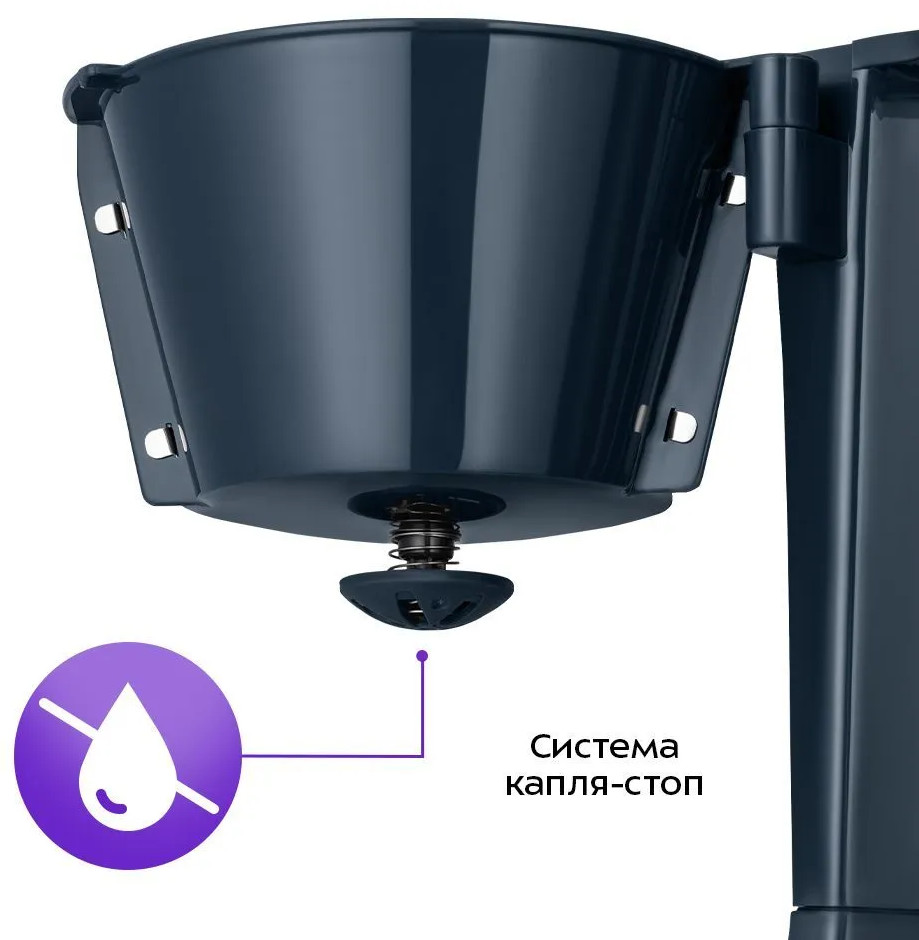 КТ-7376 имеет противокапельную систему, что позволит вам вынимать кофейник из кофеварки ещё до окончания цикла приготовления кофе. Также противокапельная система работает, если кофейник установлен, но вы вытаскиваете воронку с фильтром.