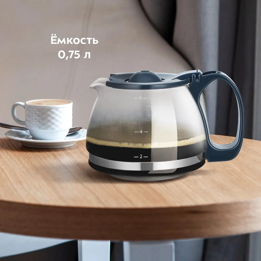 Резервуар для воды ёмкостью 0,75 л позволяет за один раз приготовить кофе на 6 чашек (по 125 мл). Кофейник стеклянный, поэтому вы всегда можете видеть, сколько кофе осталось.