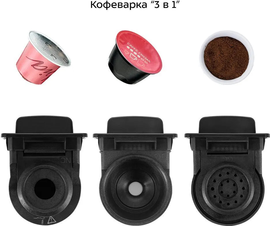 Благодаря 3 адаптерам, которые входят в комплект, кофеварка подходит для капсул типа Nespresso и Dolce Gusto, а также для молотого кофе. Она прекрасно совмещает в себе все преимущества каждого типа кофеварок и готовит под давлением 19 бар.