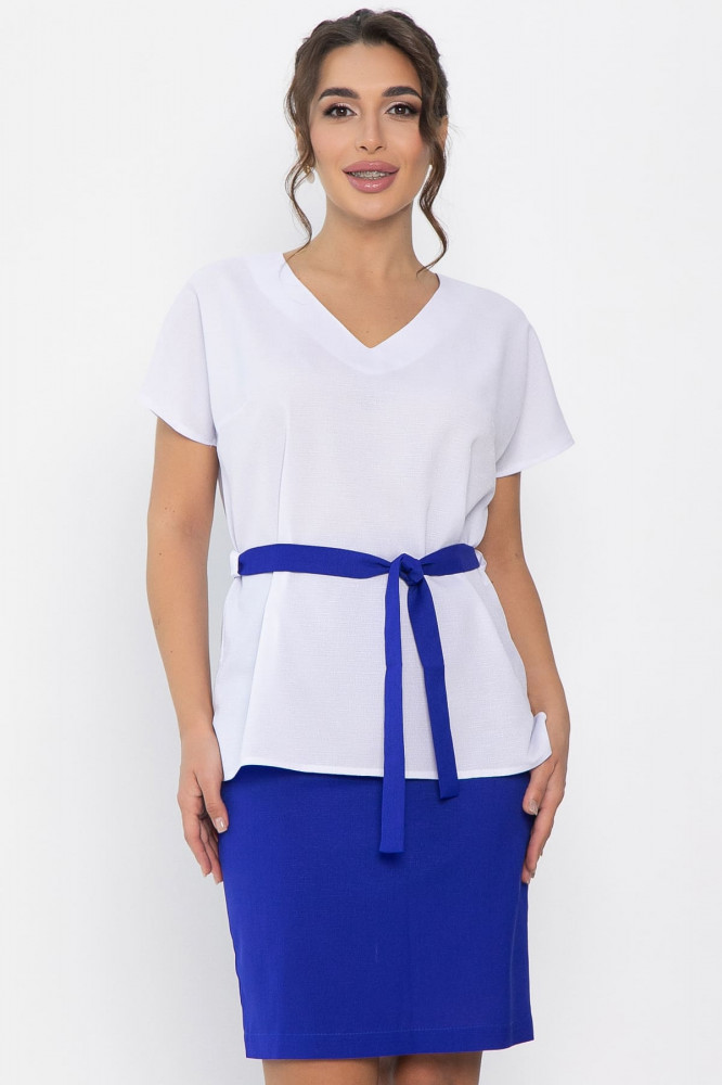 Женский юбочный костюм в бело-синей гамме, состоящий из блузы и юбки, создан для элегантных образов. Блуза свободного кроя с укороченным рукавом и V-образным вырезом подчеркнёт вашу женственность. Нагрудные вытачки спереди и пояс-завязка на талии добавляют образу романтичности и индивидуальности. Юбка прямого кроя средней длины имеет классическую длину, а вытачки на талии спереди и сзади обеспечивают идеальную посадку. Сзади юбка украшена потайной молнией, а разрез по низу позволяет свободно двигаться. Юбка выполнена на подкладке. Этот костюм станет идеальным выбором для деловых встреч, прогулок или особых случаев, сочетая в себе комфорт и стиль.