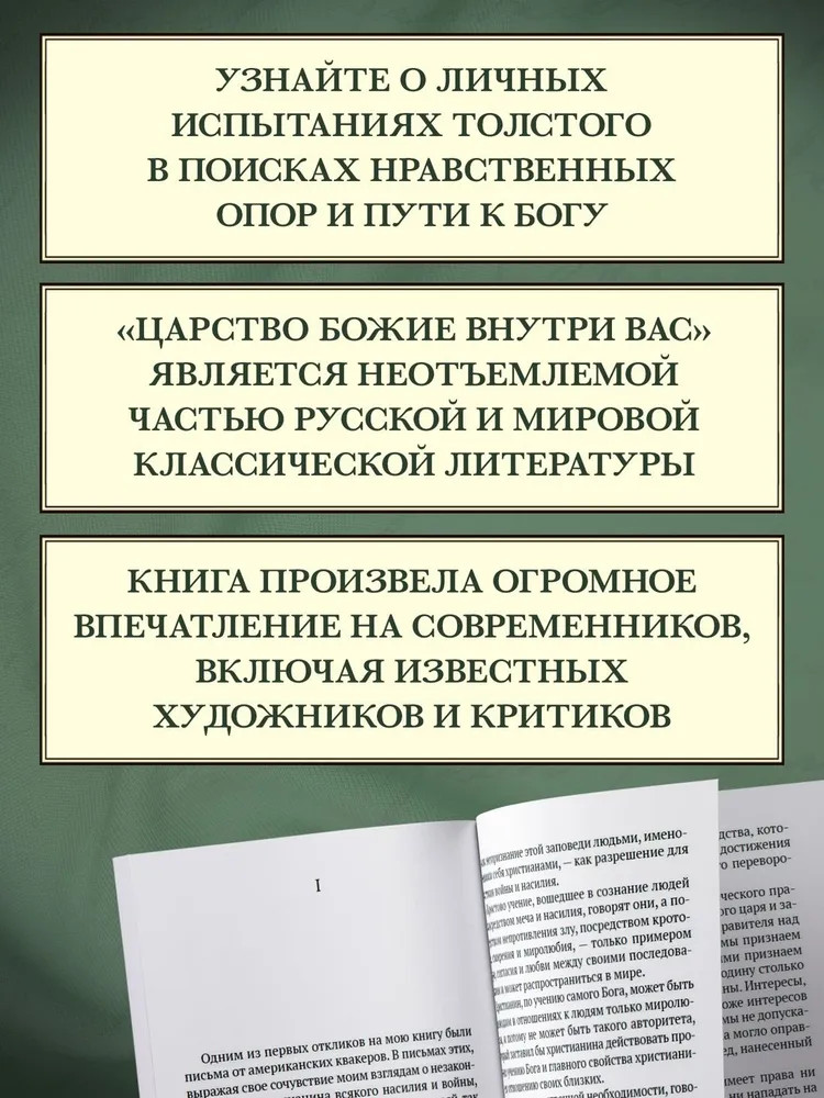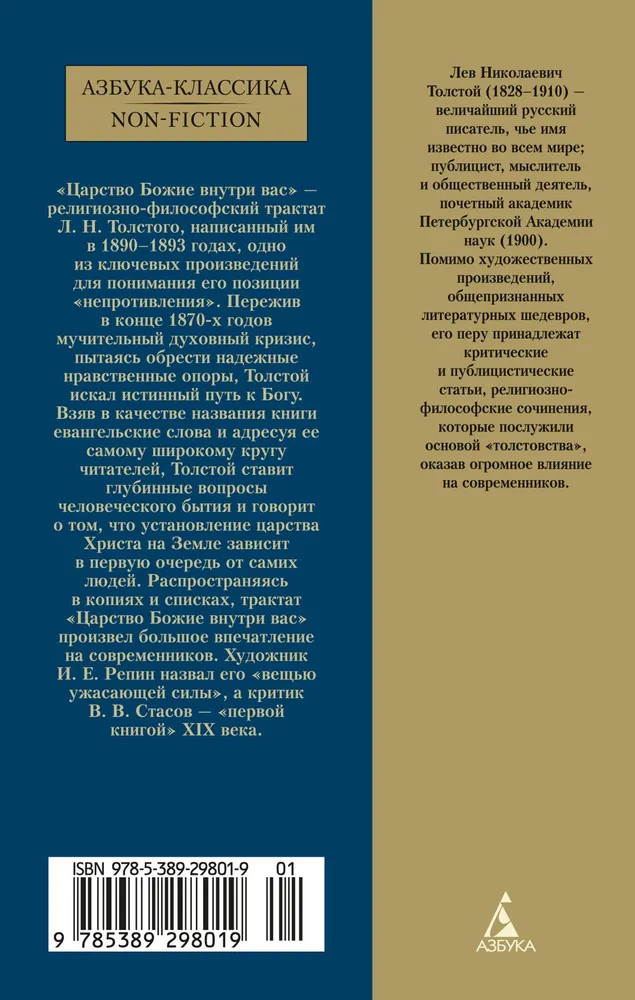 💳 Оплатить за товар можно при получении 🇰🇿 Есть бесплатная доставка по Казахстану от 1 дня 🎁 Копите бонусы с каждой покупки Серия: Азбука-Классика. Non-Fiction «Царство Божие внутри вас» — религиозно-философский трактат Л. Н. Толстого, написанный им в 1890–1893 годах, одно из ключевых произведений для понимания его позиции «непротивления». Пережив в конце 1870-х годов мучительный духовный кризис, пытаясь обрести надежные нравственные опоры, Толстой искал истинный путь к Богу. Взяв в качестве названия книги евангельские слова и адресуя ее самому широкому кругу читателей, Толстой ставит глубинные вопросы человеческого бытия и говорит о том, что установление царства Христа на Земле зависит в первую очередь от самих людей. Распространяясь в копиях и списках, трактат «Царство Божие внутри вас» произвел большое впечатление на современников. Художник И. Е. Репин назвал его «вещью ужасающей силы», а критик В. В. Стасов — «первой книгой» XIX века. |