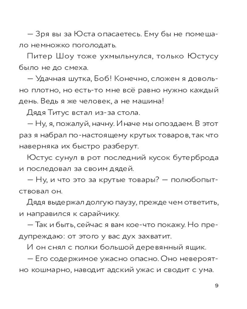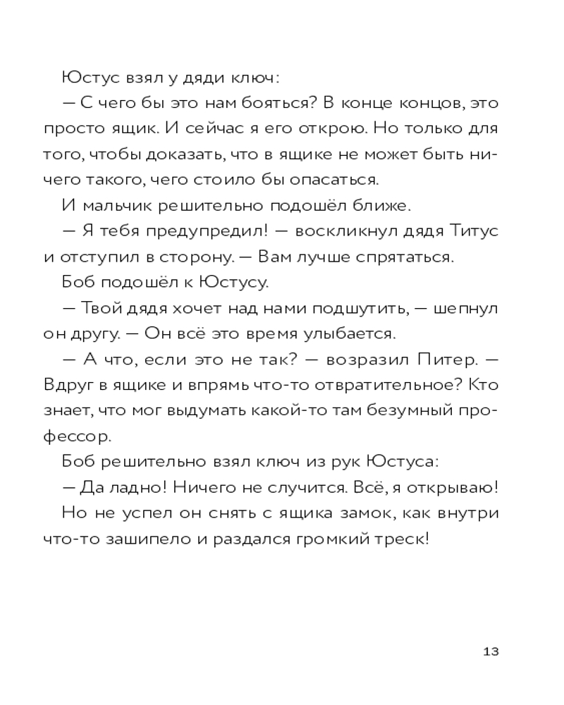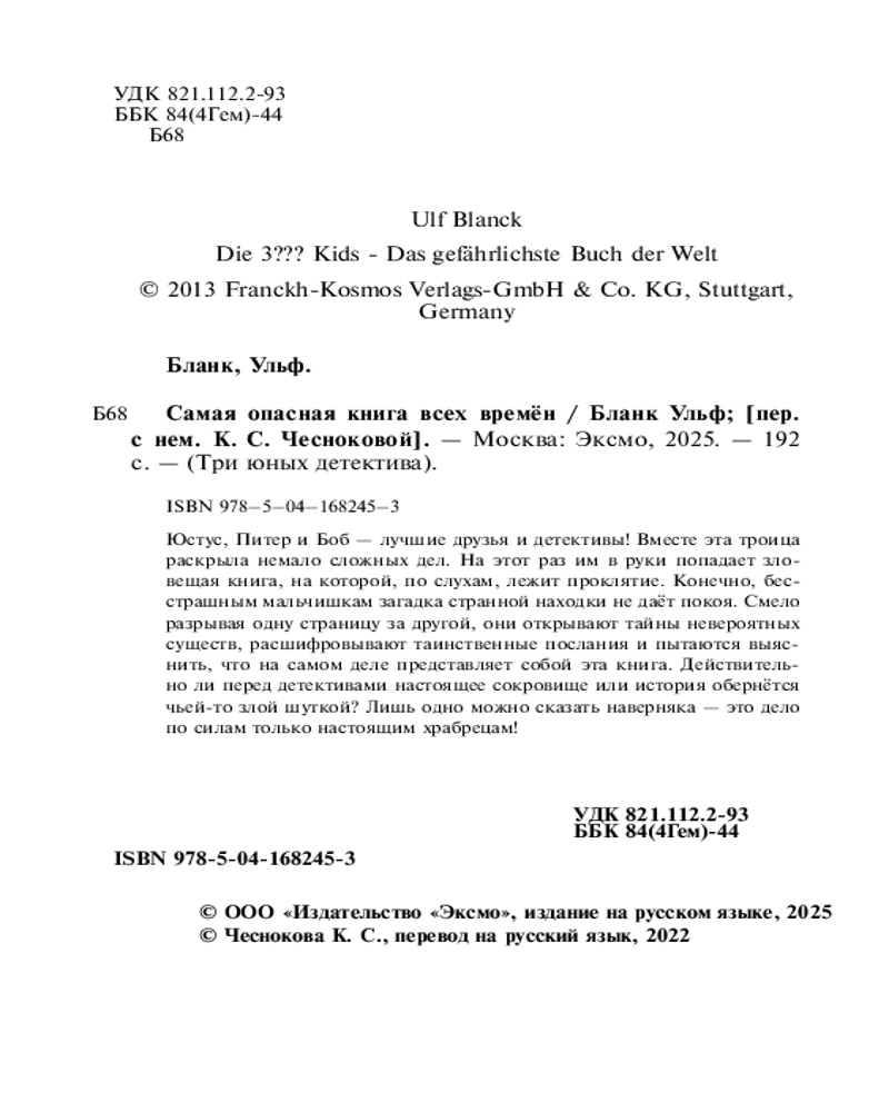 💳 Оплатить за товар можно при получении 🇰🇿 Есть бесплатная доставка по Казахстану от 1 дня 🎁 Копите бонусы с каждой покупки Серия: Три юных детектива Уникальный формат, в котором читателю придется самому разрезать страницы, чтобы узнать продолжение истории! Юстус, Питер и Боб — лучшие друзья и детективы! Вместе эта троица раскрыла немало сложных дел. На этот раз они им в руки попадает зловещая книга, на которой, по слухам, лежит проклятие. Конечно, бесстрашным мальчишкам загадка странной находки не дает покоя. Смело разрывая одну страницу за другой, они открывают тайны невероятных существ, расшифровывают таинственные послания и пытаются выяснить, что на самом деле представляет собой эта книга. Действительно ли перед детективами настоящее сокровище или история обернется чьей-то злой шуткой? Лишь одно можно сказать наверняка — это дело по силам лишь настоящим храбрецам! |