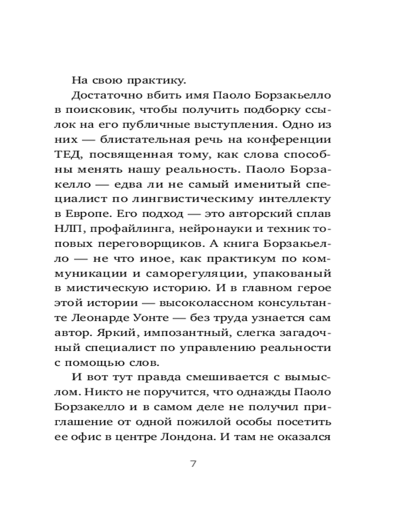 💳 Оплатить за товар можно при получении 🇰🇿 Есть бесплатная доставка по Казахстану от 1 дня 🎁 Копите бонусы с каждой покупки Серия: Книги, о которых говорят Мистерия об искусстве убеждения от итальянского коуча экстра-класса. Однажды знаменитого тренера по переговорам Леонарда Уонта пригласили на собеседование к очень богатой клиентке. Пожилая эксцентричная дама готова была платить за консультацию в пять раз больше обычного прайса. Условие — Уонт должен помочь принять ей правильное решение. Главный герой соглашается. И только к концу первой сессии с ужасом понимает, что на кону жизнь всего человечества. |