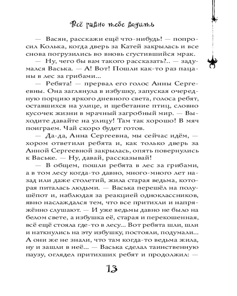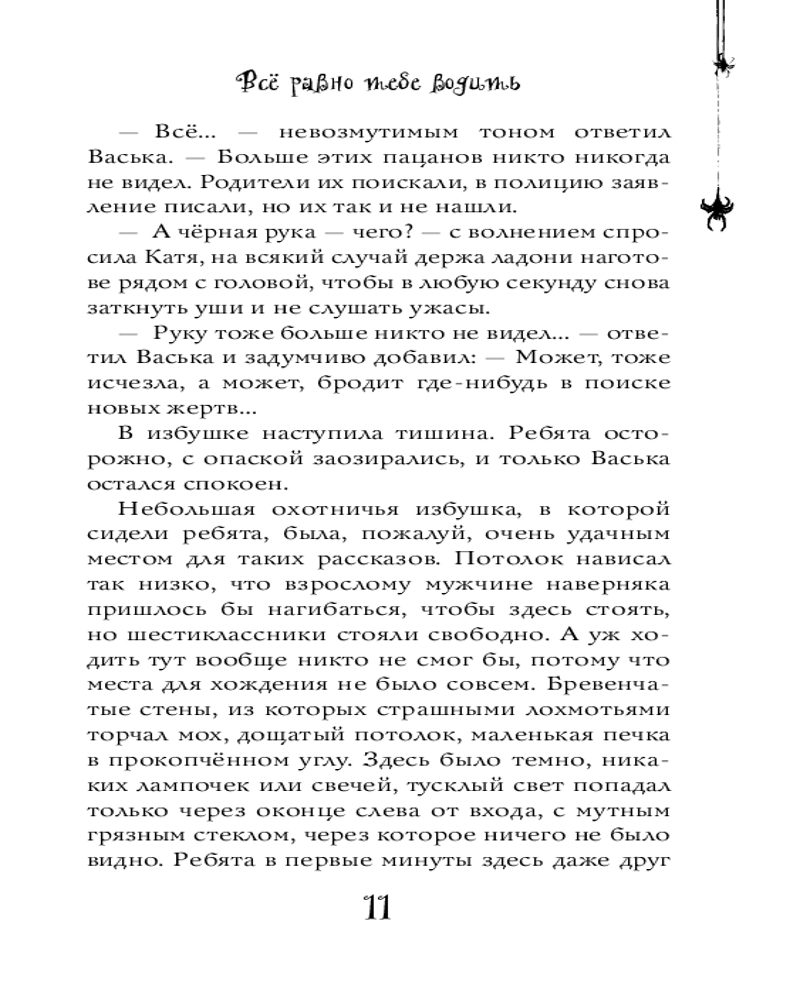 «Всё равно тебе водить» — рассказ о группе школьников, которые отправились в поход, заблудились и решили переночевать в маленькой охотничьей хижине, рассказывая страшные истории. Но разве могли ребята подумать, что все кошмары вдруг станут реальностью? Монстра не видно, но он точно есть: кто-то скребет половицы, бегает и зовет поиграть. Но вдруг эта игра опасна для жизни?..