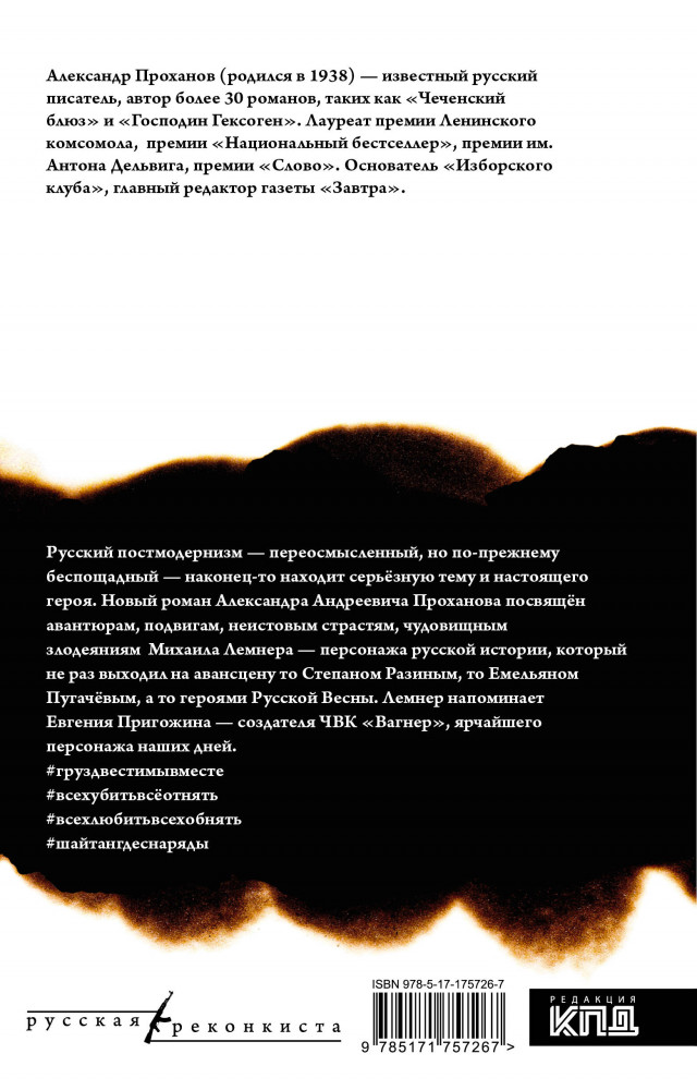 💳 Оплатить за товар можно при получении 🇰🇿 Есть бесплатная доставка по Казахстану от 1 дня 🎁 Копите бонусы с каждой покупки Серия: Русская Реконкиста Русский постмодернизм — переосмысленный, но по-прежнему беспощадный — наконец-то находит серьёзную тему и настоящего героя. Новый роман Александра Андреевича Проханова посвящён авантюрам, подвигам, неистовым страстям, чудовищным злодеяниям Михаила Лемнера — персонажа русской истории, который не раз выходил на авансцену то Степаном Разиным, то Емельяном Пугачёвым, а то героями Русской Весны. |