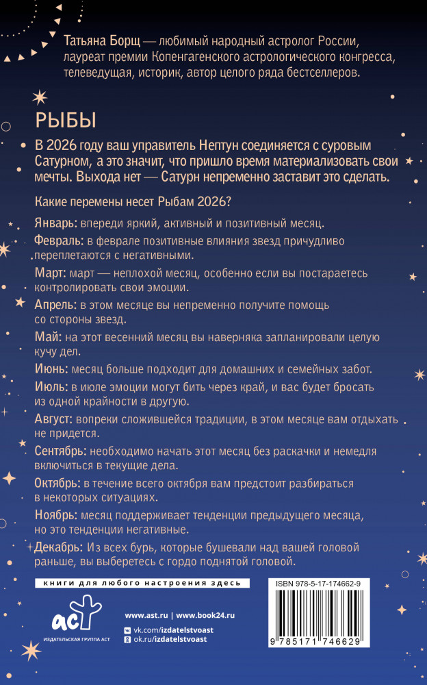 💳 Оплатить за товар можно при получении 🇰🇿 Есть бесплатная доставка по Казахстану 🎁 Копите бонусы с каждой покупки Серия: Борщ. Календари 2026 Татьяна Борщ — любимый народный астролог России, лауреат премии Копенгагенского астрологического конгресса, телеведущая, историк, автор целого ряда бестселлеров. |