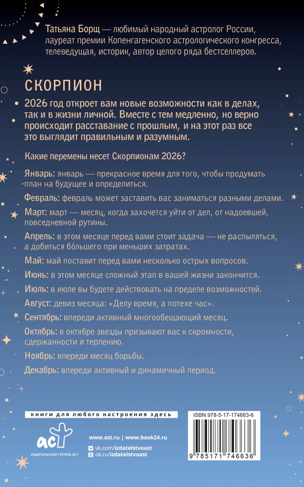 💳 Оплатить за товар можно при получении 🇰🇿 Есть бесплатная доставка по Казахстану от 1 дня 🎁 Копите бонусы с каждой покупки Серия: Борщ. Календари 2026 Татьяна Борщ — любимый народный астролог России, лауреат премии Копенгагенского астрологического конгресса, телеведущая, историк, автор целого ряда бестселлеров. |