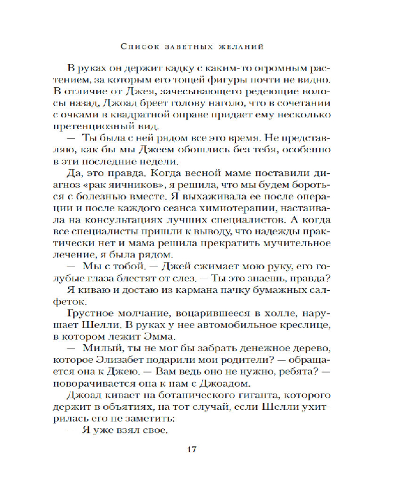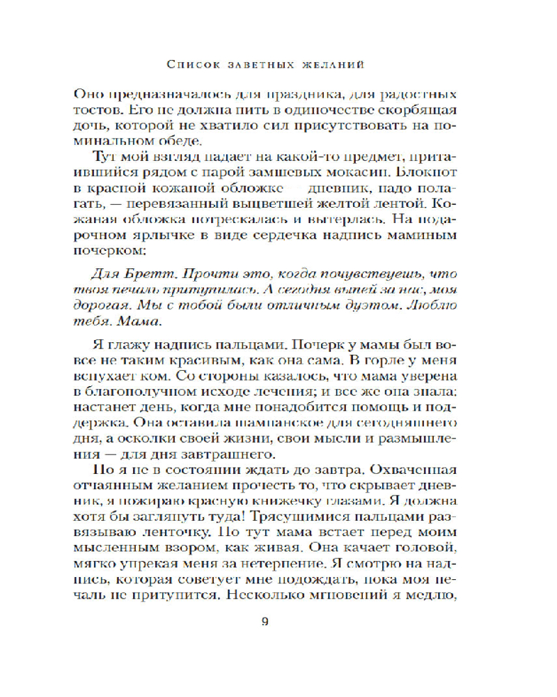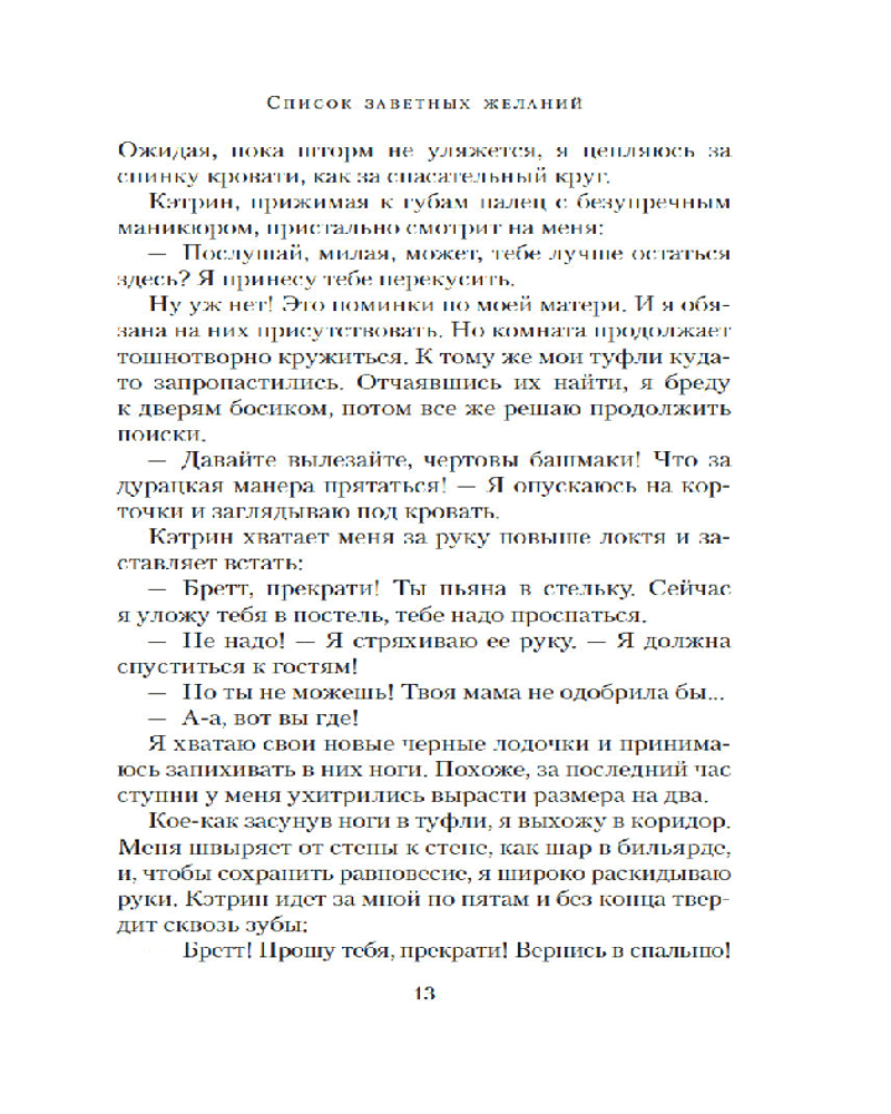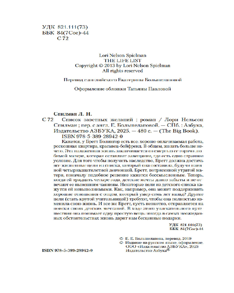 💳 Оплатить за товар можно при получении 🇰🇿 Есть бесплатная доставка по Казахстану от 1 дня 🎁 Копите бонусы с каждой покупки Серия: The Big Book Кажется, у Бретт Болингер есть все: хорошо оплачиваемая работа, роскошная квартира, красавец-бойфренд. В общем, желать больше нечего. Эта налаженная жизнь заканчивается со смертью ее горячо любимой матери, которая оставляет завещание, где есть одно странное условие. Для того чтобы получить наследство, Бретт должна достичь все жизненные цели из списка, который она составила, будучи наивной четырнадцатилетней девчонкой. Бретт, потрясенной утратой матери, поначалу подобное решение кажется бессмысленным. Теперь, когда ей тридцать четыре года, детские мечты давно забыты и не отвечают ее нынешним чаяниям. Некоторые цели из детского списка кажутся ей невыполнимыми. Как, например, она может поддерживать хорошие отношения с отцом, который умер семь лет назад? Другие цели (стать крутой учительницей) требуют, чтобы она полностью изменила свою жизнь. И все же Бретт, пусть неохотно, отправляется на поиски своих детских мечтаний. В ходе этого увлекательного путешествия она понимает одну простую вещь: иногда в самых неожиданных обстоятельствах жизнь дарит нам бесценные подарки. |