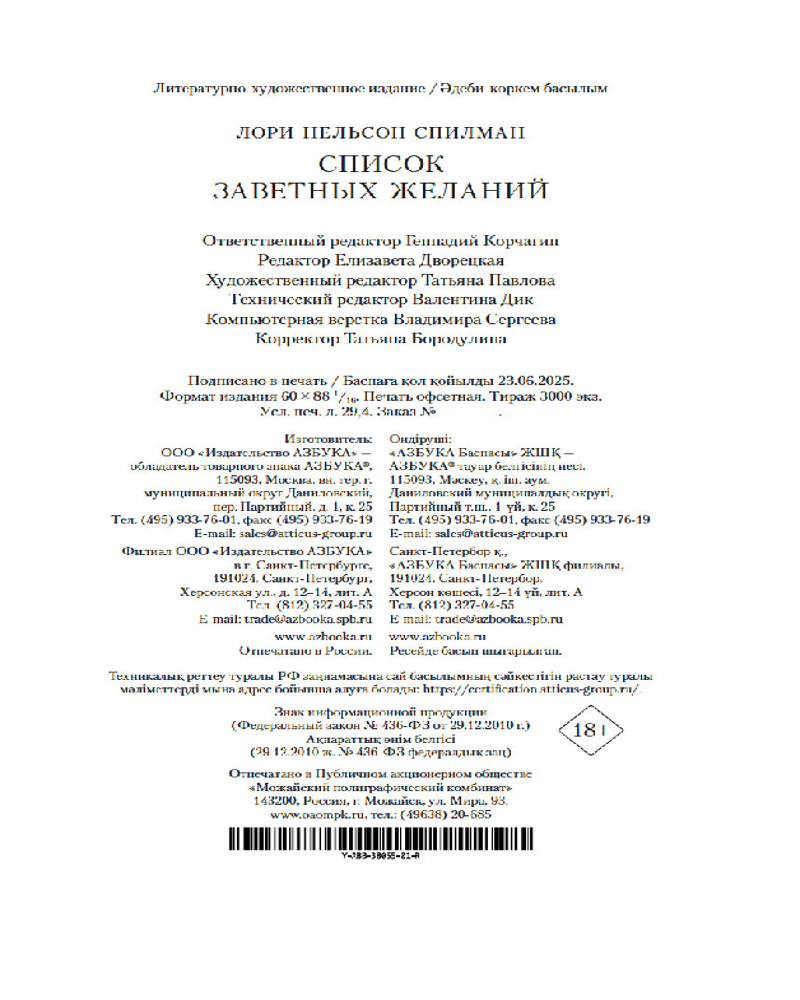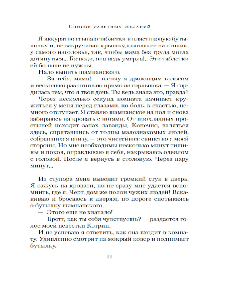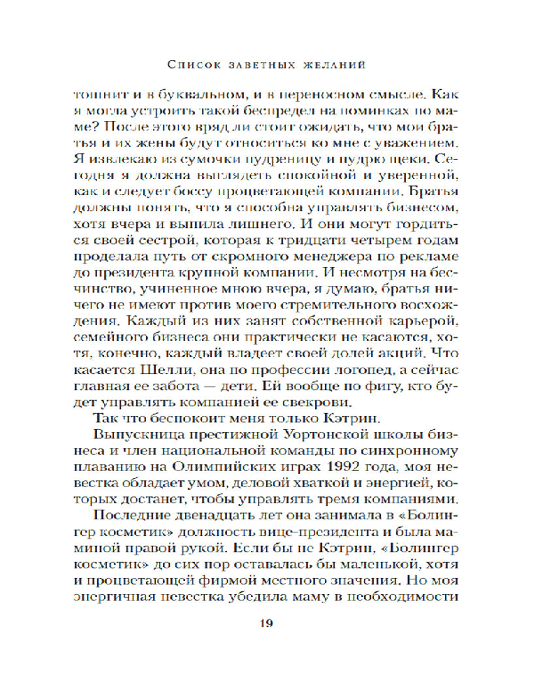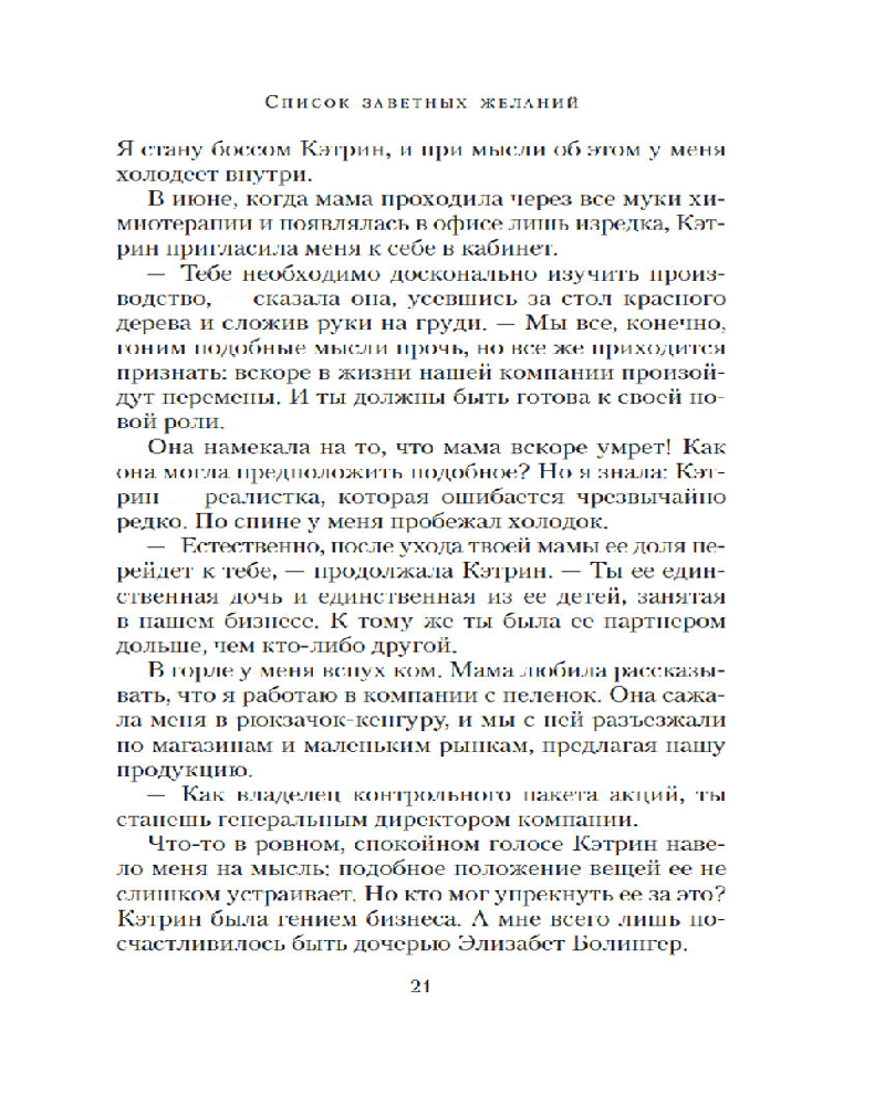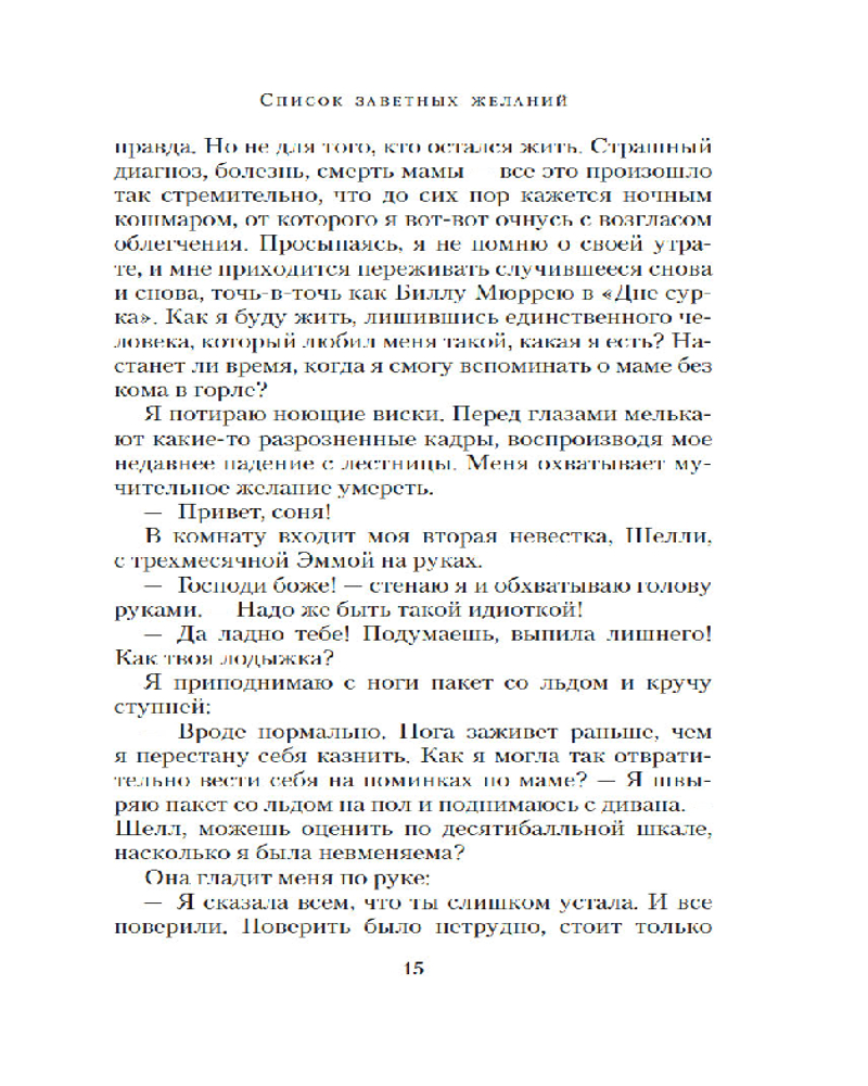 💳 Оплатить за товар можно при получении 🇰🇿 Есть бесплатная доставка по Казахстану от 1 дня 🎁 Копите бонусы с каждой покупки Серия: The Big Book Кажется, у Бретт Болингер есть все: хорошо оплачиваемая работа, роскошная квартира, красавец-бойфренд. В общем, желать больше нечего. Эта налаженная жизнь заканчивается со смертью ее горячо любимой матери, которая оставляет завещание, где есть одно странное условие. Для того чтобы получить наследство, Бретт должна достичь все жизненные цели из списка, который она составила, будучи наивной четырнадцатилетней девчонкой. Бретт, потрясенной утратой матери, поначалу подобное решение кажется бессмысленным. Теперь, когда ей тридцать четыре года, детские мечты давно забыты и не отвечают ее нынешним чаяниям. Некоторые цели из детского списка кажутся ей невыполнимыми. Как, например, она может поддерживать хорошие отношения с отцом, который умер семь лет назад? Другие цели (стать крутой учительницей) требуют, чтобы она полностью изменила свою жизнь. И все же Бретт, пусть неохотно, отправляется на поиски своих детских мечтаний. В ходе этого увлекательного путешествия она понимает одну простую вещь: иногда в самых неожиданных обстоятельствах жизнь дарит нам бесценные подарки. |